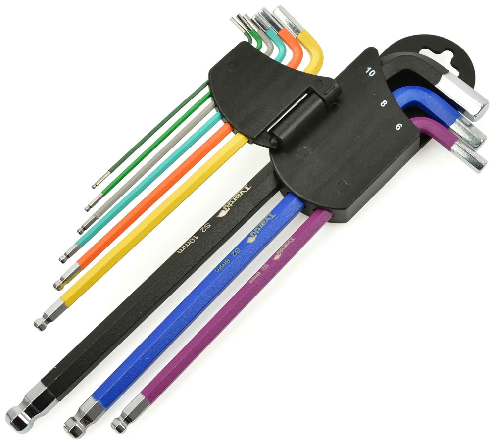 Sada dlhých šesťhranných imbusových kľúčov . Vyrobené z vysoko kvalitnej ocele S2, ktorá je oveľa odolnejšia ako bežne používaná nástrojová oceľ CrV . Dĺžka kľúča umožňuje prácu na ťažko dostupných miestach. Rôzne farby kľúčov uľahčujú výber správnej veľkosti kľúča.