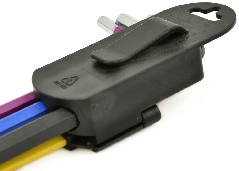 každý kľúč má inú farbu , čo urýchľuje výber vhodnej veľkosti kľúča. kľúče sú umiestnené v šikovnom organizéri, ktorý možno zavesiť na stenu