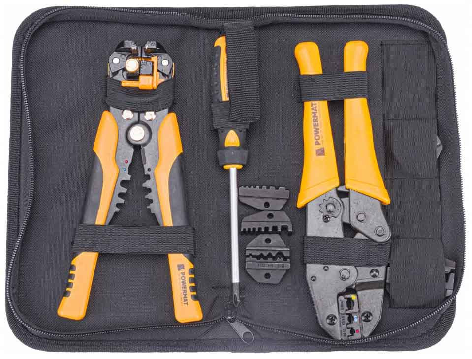 Sada klieští na odizolovanie a lisovanie koncoviek káblov s výmennými čelusťami, POWERMAT