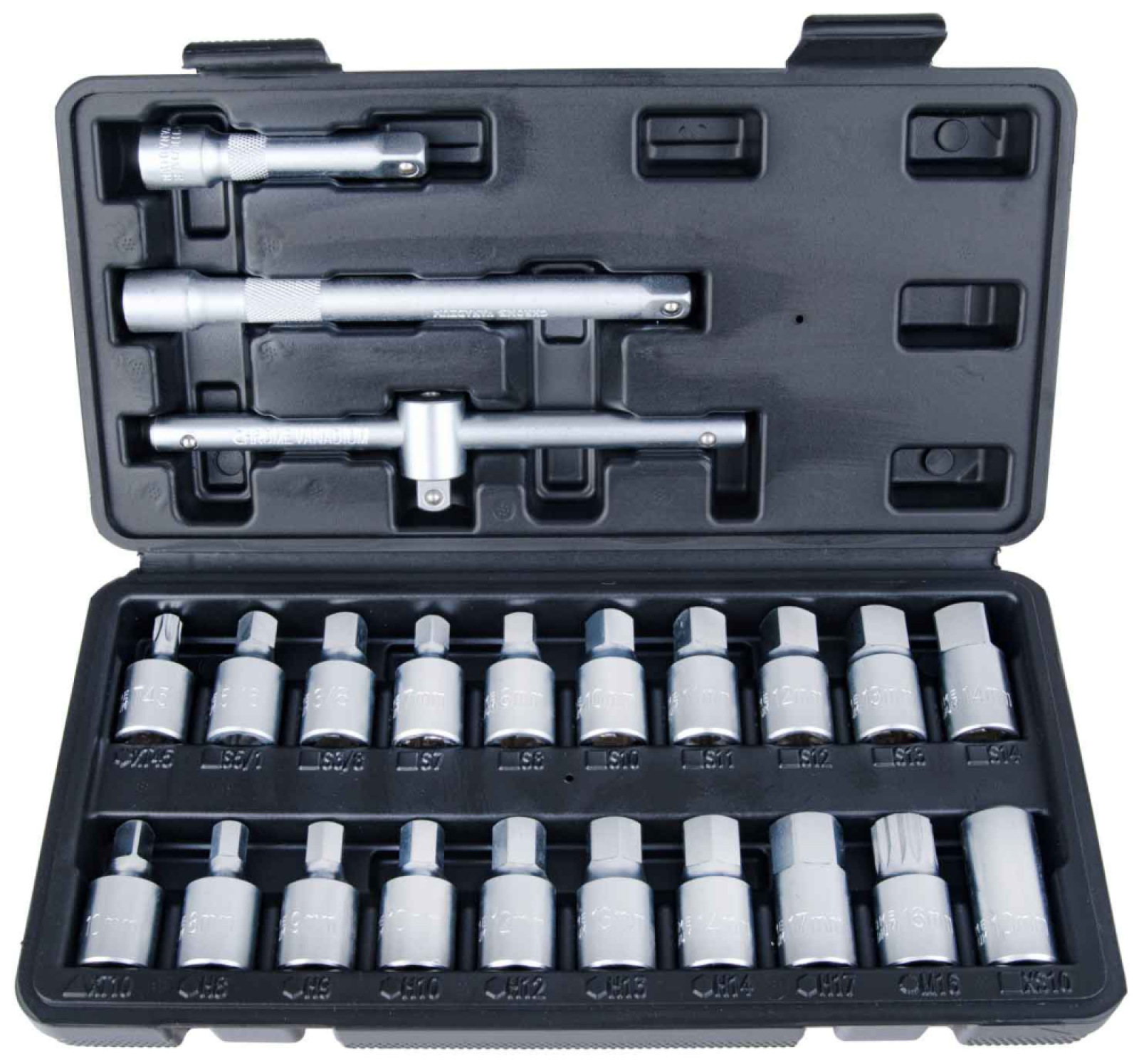 23-dielna sada kľúčov na uzávery olejovej nádrže určená pre širokú škálu použití v automobilových dielňach, na staniciach technickej kontroly vozidiel a pre domácich majstrov. Vyrobená z chróm-vanádovej (CrV) ocele zaručuje odolnosť voči deformácii, prasklinám a oderu – aj pri veľmi tesných uzáveroch.