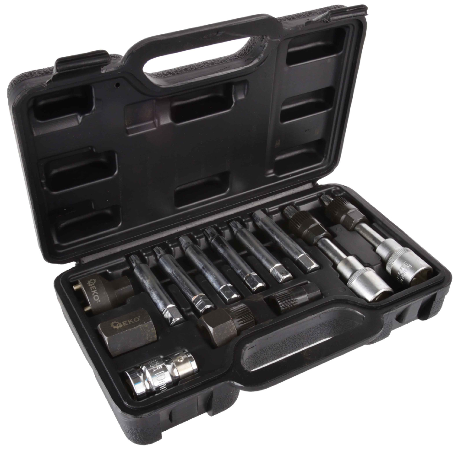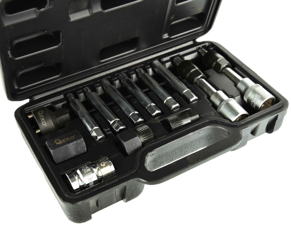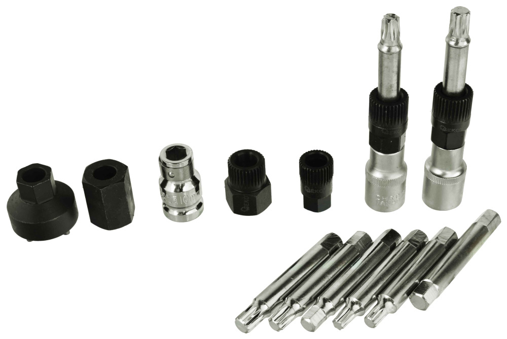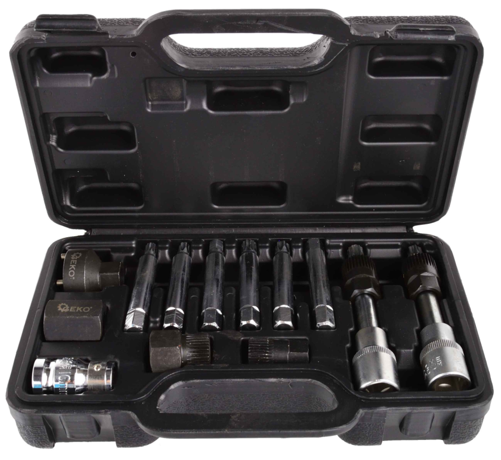 Sada kľúčov na montáž a demontáž alternátorov. Kľúče sú vyrobené z vysoko kvalitnej chróm-vanádiovej ocele CrV, vďaka čomu sú odolné voči poškodeniu. Kľúče umožňujú súčasné odskrutkovanie skrutky zaisťujúcej remenicu a pridržiavanie kolesa spojkou.
