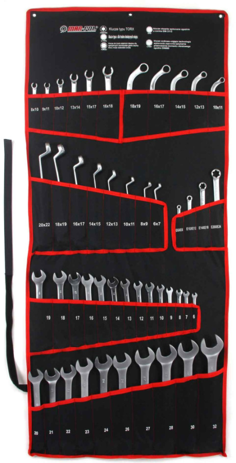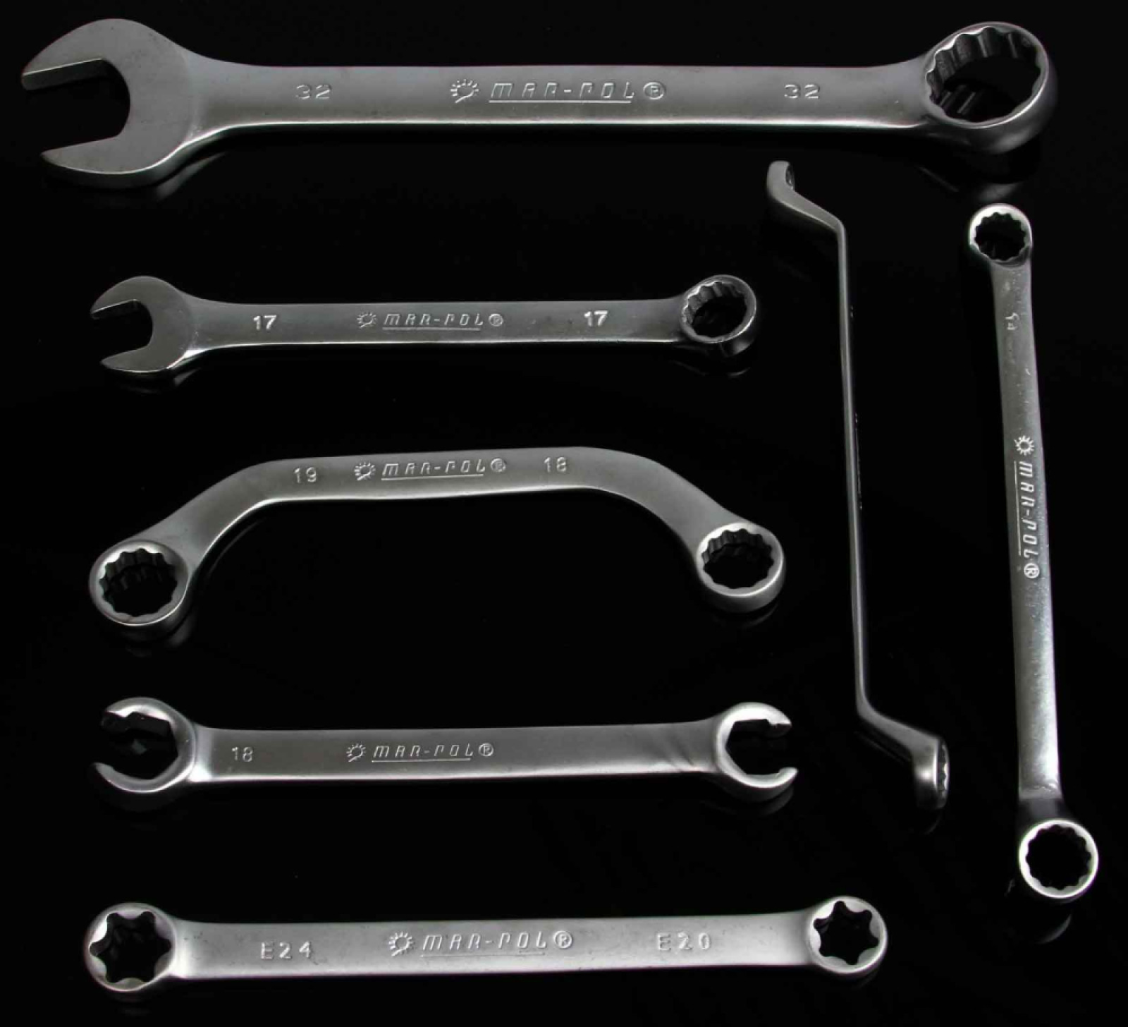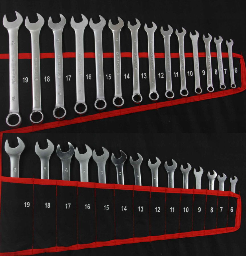 kombinované vidlicové kľúče: 6; 7; 8; 9; 10; 11; 12; 13; 14; 15; 16; 17; 18; 19; 20; 21; 22; 23; 24; 26; 27; 28; 30; 32 mm