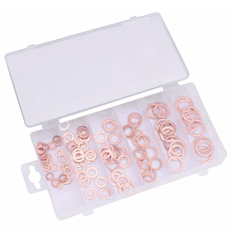 Sada medených podložiek pozostáva zo 110 ks medených podložiek určených na utesnenie spojov pod skrutky. Podložky vyrobené z mäkkej medi majú schopnosť prispôsobiť sa tvaru šrúby pri utiahnutí, čím zabezpečujú účinné utesnenie. Súprava je praktickou pomôckou v autodielňach a domácich garážach. Súprava obsahuje priehľadný organizér s priehradkami, ktorý uľahčuje oddeľovanie a ukladanie podložiek rôznych veľkostí.