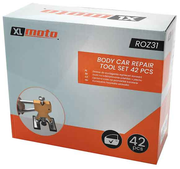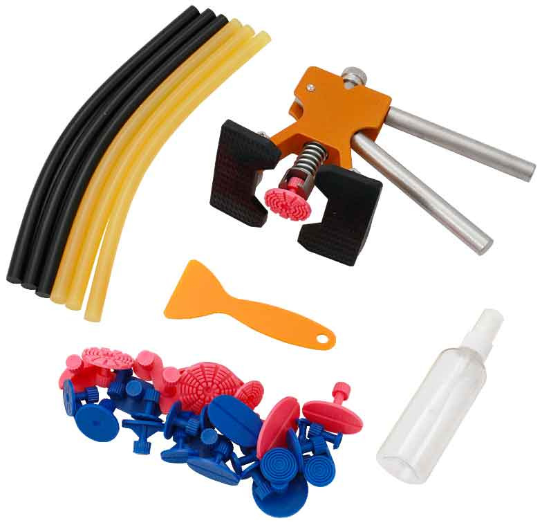 Opravná sada určená na odstránenie preliačin na karosérii auta. Súprava sa ľahko používa a hlavne je 100% bezpečná pre lak auta. Sada obsahuje sťahovák na odstraňovanie priehlbín, súpravu 40 hríbov rôznych tvarov a veľkostí, 7 tyčiniek tavného lepidla, špachtľu na odstraňovanie lepidla a 100 ml fľaštičku s rozprašovačom.