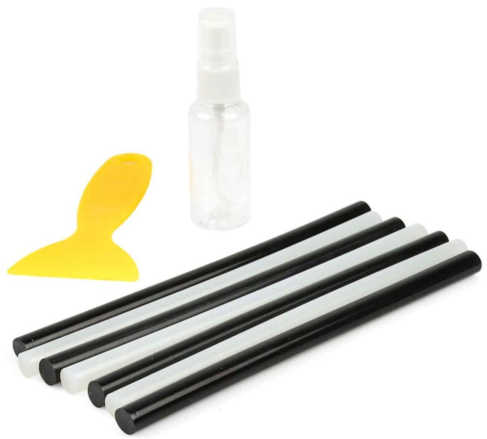 Opravná sada určená na odstránenie preliačin na karosérii auta. Súprava sa ľahko používa a hlavne je 100% bezpečná pre lak auta. Sada obsahuje sťahovák na odstraňovanie priehlbín, súpravu 40 hríbov rôznych tvarov a veľkostí, 7 tyčiniek tavného lepidla, špachtľu na odstraňovanie lepidla a 2x 100 ml prázdnu fľaštičku s rozprašovačom.