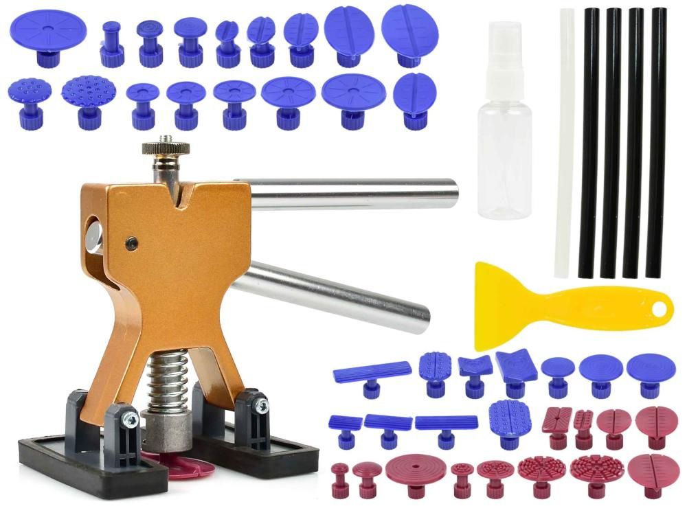 Opravná sada určená na odstránenie preliačin na karosérii auta. Súprava sa ľahko používa a hlavne je 100% bezpečná pre lak auta. Sada obsahuje sťahovák na odstraňovanie priehlbín, súpravu 40 hríbov rôznych tvarov a veľkostí, 7 tyčiniek tavného lepidla, špachtľu na odstraňovanie lepidla a 2x 100 ml prázdnu fľaštičku s rozprašovačom.