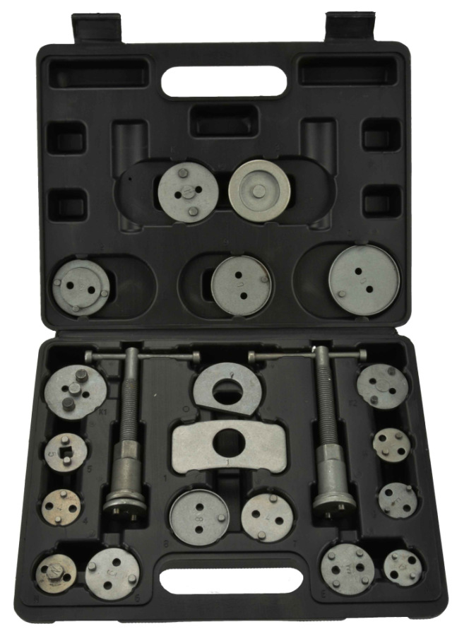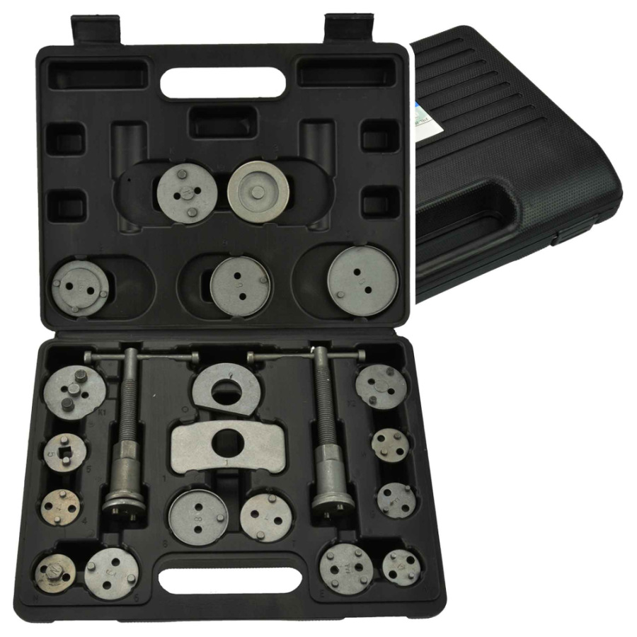 Profesionálna 21-dielna súprava na vytláčanie brzdových piestov, nevyhnutná pri oprave vozidiel vybavených kotúčovými brzdami.