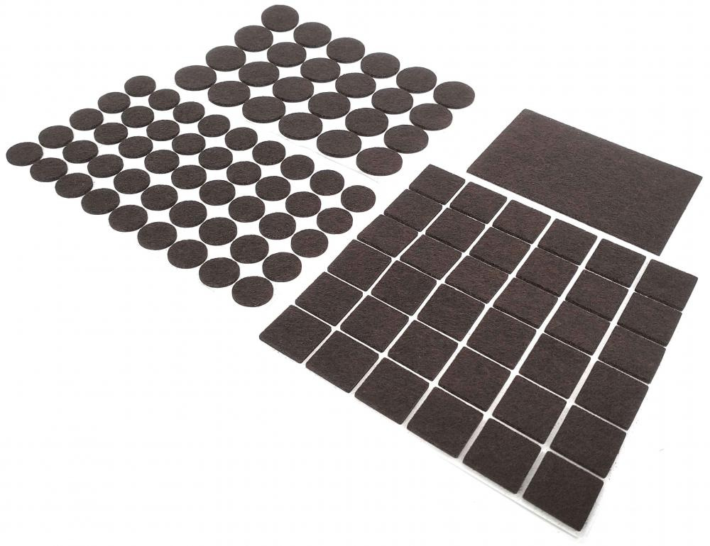 Lepiace plstené podložky (klzáky) na nábytkovú súpravu. Sada obsahuje 106 ks rôznych druhov.