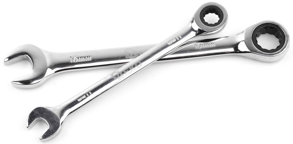 Sada kombinovaných kľúčov s račňou (72 zubový mechanizmus) 8-19mm z odolnej chróm-vanádiovej ocele (CrV). Uplatnia sa v profesionálnych autodielňach aj v domácej garáži. Kľúče sú umiestnené v praktickej plachte, ktorú je možné zavesiť na stenu.
