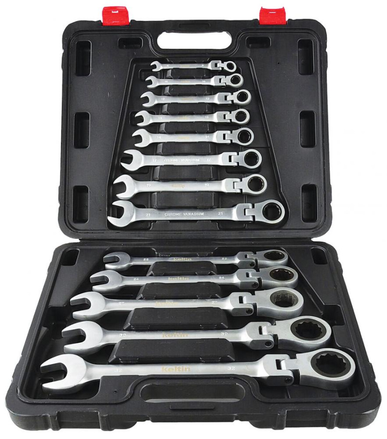 Sada kombinovaných kľúčov s račňou vyrobených z odolnej chróm-vanádiovej ocele (CrV). Používajú sa v profesionálnych dielňach, ako aj v domácich garážach.