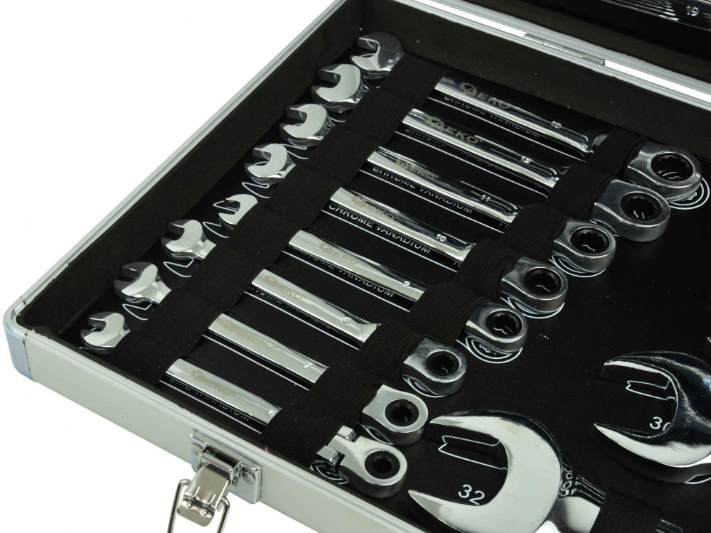 Sada kombinovaných kľúčov s račňou (72 zubov, 6-32 mm) vyrobená z odolnej chróm-vanádiovej ocele (CrV). Použitie vhodné v profesionálnych dielňach pre automobily, ako aj v domácich garážach. Kľúče sú umiestnené v hliníkovom kufríku.