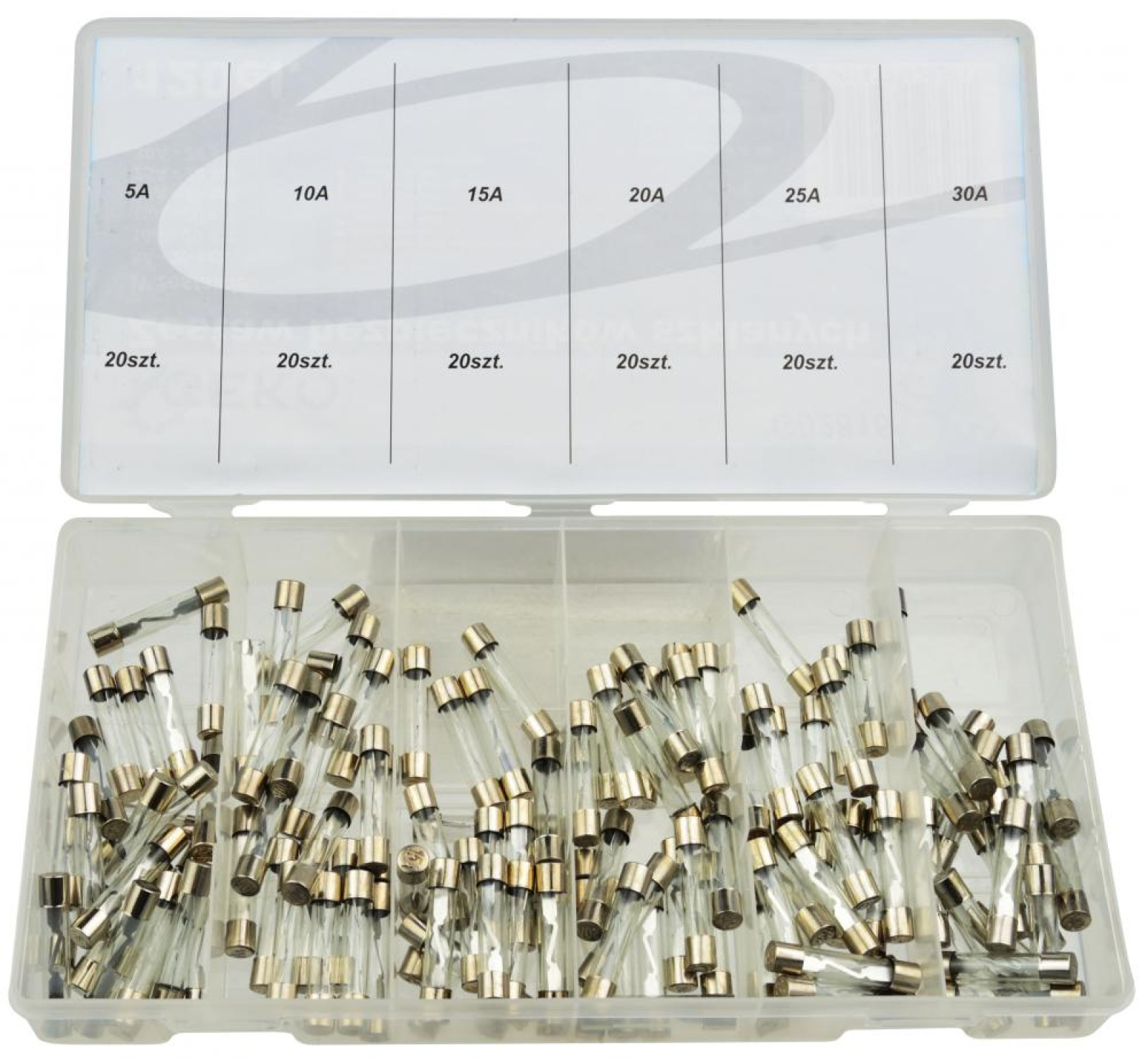 Sada sklenených poistiek, 5,10,15,20,25,30 A, 120-dielna, GEKO