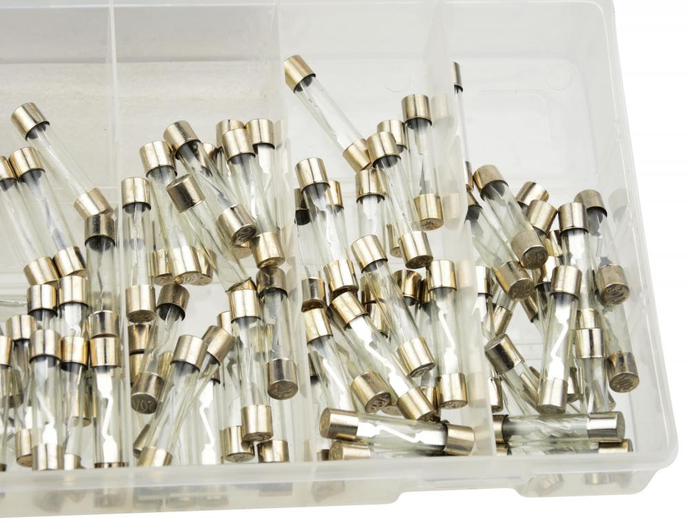 Sada 120 sklených poistiek so 6 rôznymi prúdmi od 5A do 30A v plastovej nádobke s praktickými priehradkami.