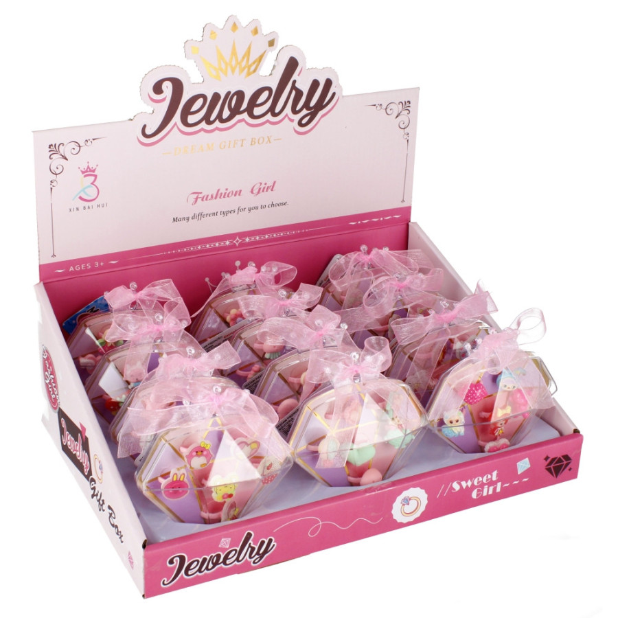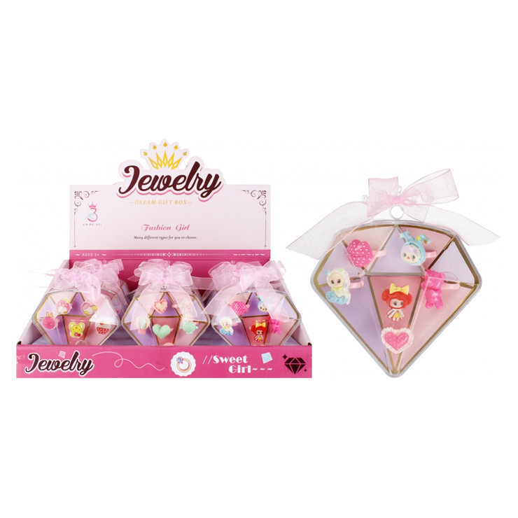 Sada šperkov, obsah sady je mix prsteňov. Rozmery produktu - diamant sú 10x11x6cm. Sada je určená pre deti vo veku 3+. Cena je za 1 kus. Balené v balení po 12 kusoch.