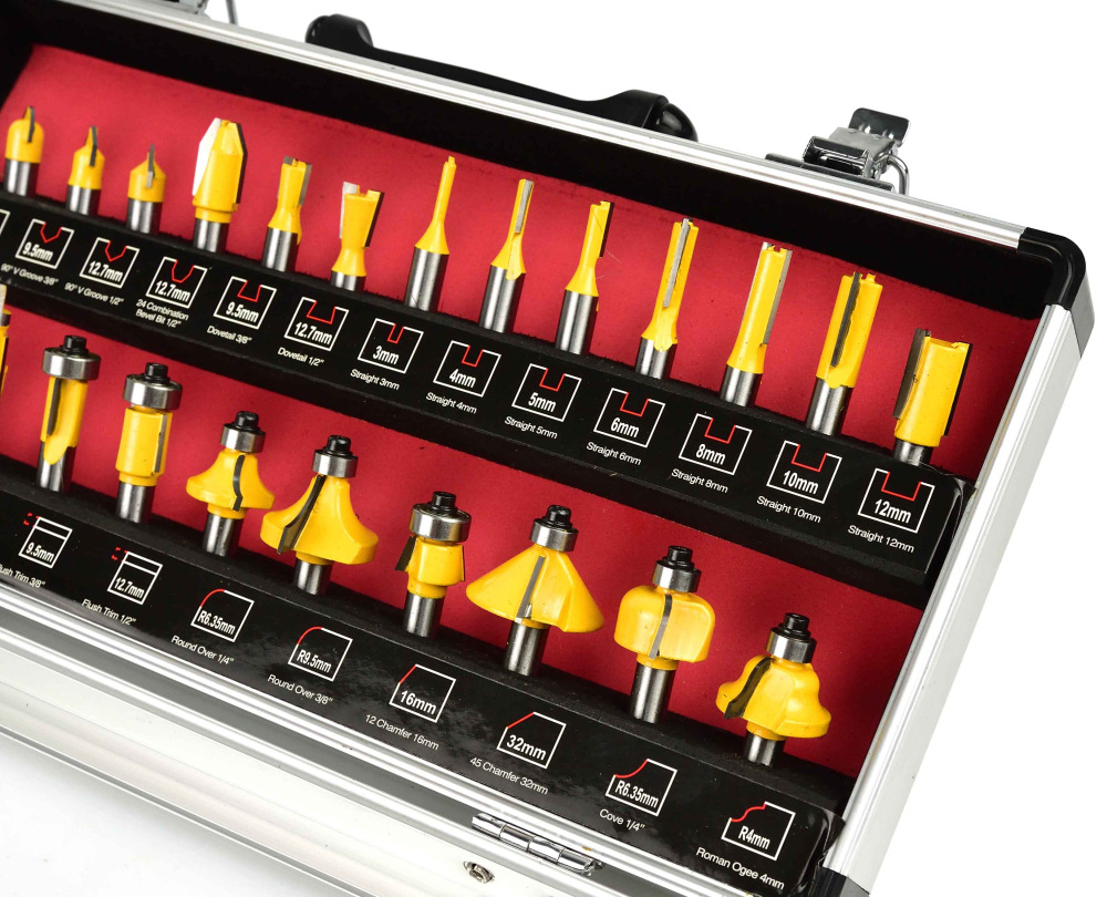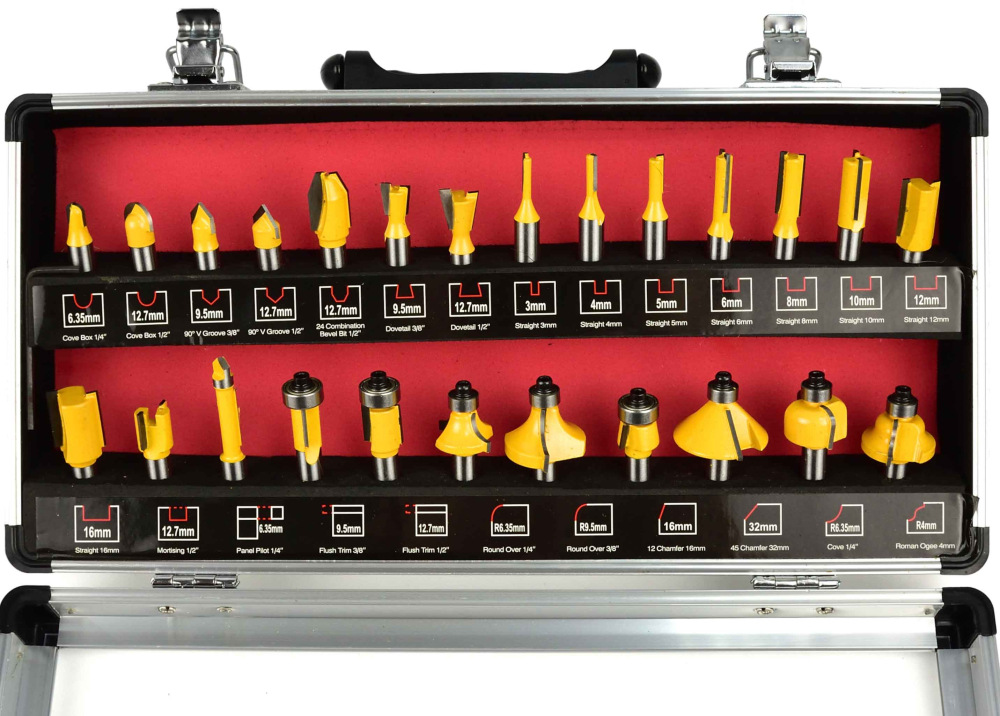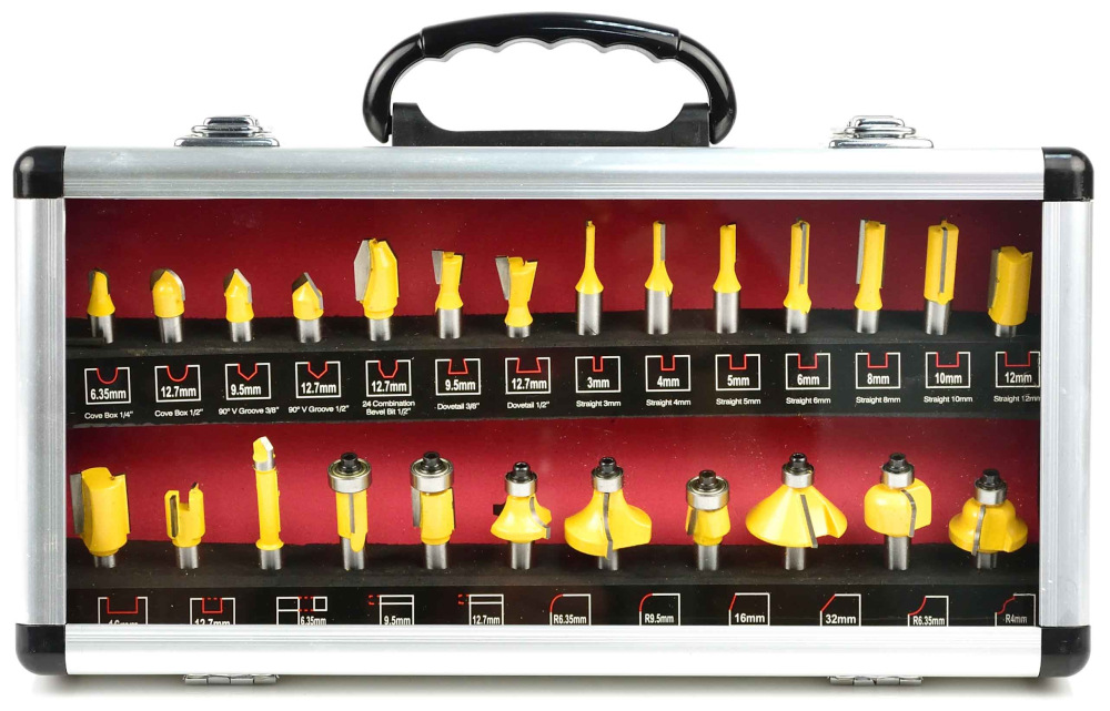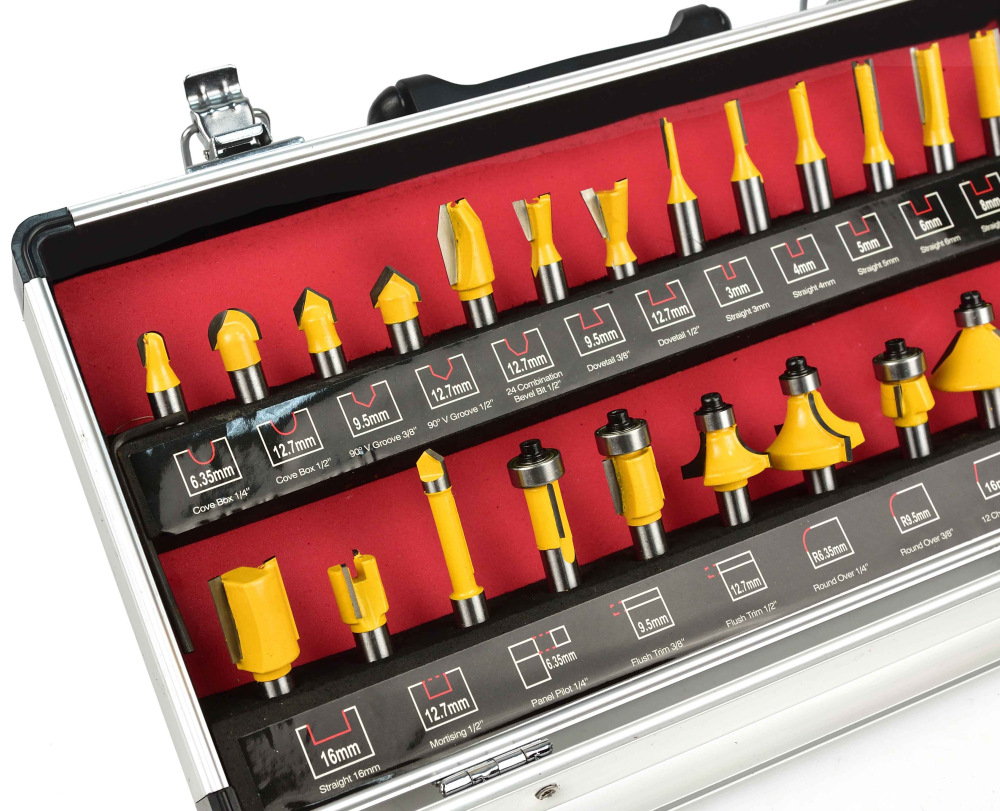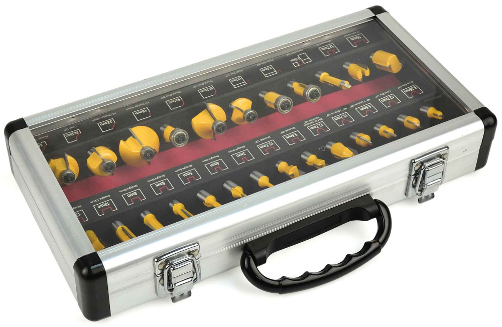 Sada 25 tvarových fréz na drevo umožňujúce presné opracovanie materiálu. Čepele z rýchloreznej ocele HSS umožňujú použitie fréz na spracovanie masívneho dreva, drevotriesky, MDF a iných materiálov na báze dreva. Použité ložiská znižujú valivý odpor, preto sú frézy ideálne na tvarovanie guľatých materiálov. Celá sada je umiestnená v praktickom drevenom kufríku, kde má každá fréza svoje podpísané miesto.