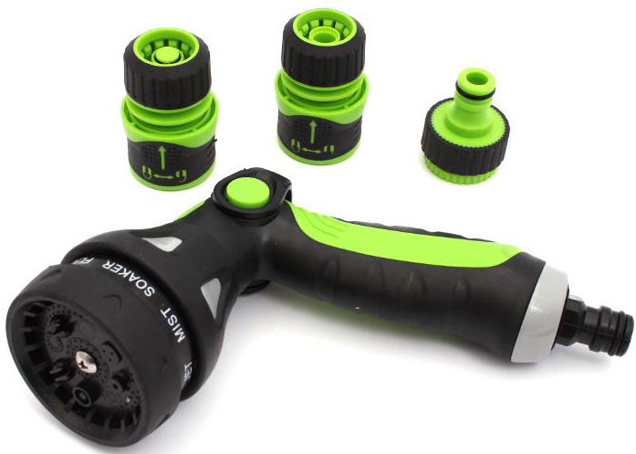 Sada pre 1/2" záhradnú hadicu: striekacia pištoľ s 8 funkciami, 1/2" alebo 5/8" rýchlospojka s funkciou STOP, 1/2" alebo 5/8" rýchlospojka, kohútikové pripojenie 1" alebo 3/4“.