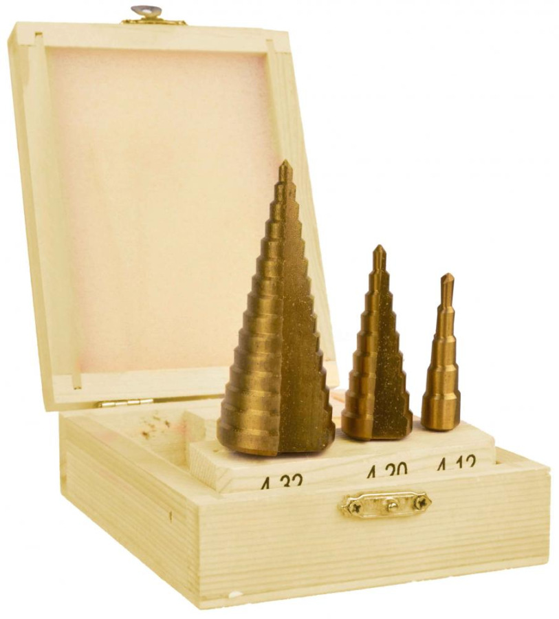 Sada stupňovitých vrtákov vyrobených z titánovej ocele HSS. Táto súprava umožňuje vŕtať dokonale okrúhle otvory do ocele, mosadze, medi, hliníka, dreva a plastu.