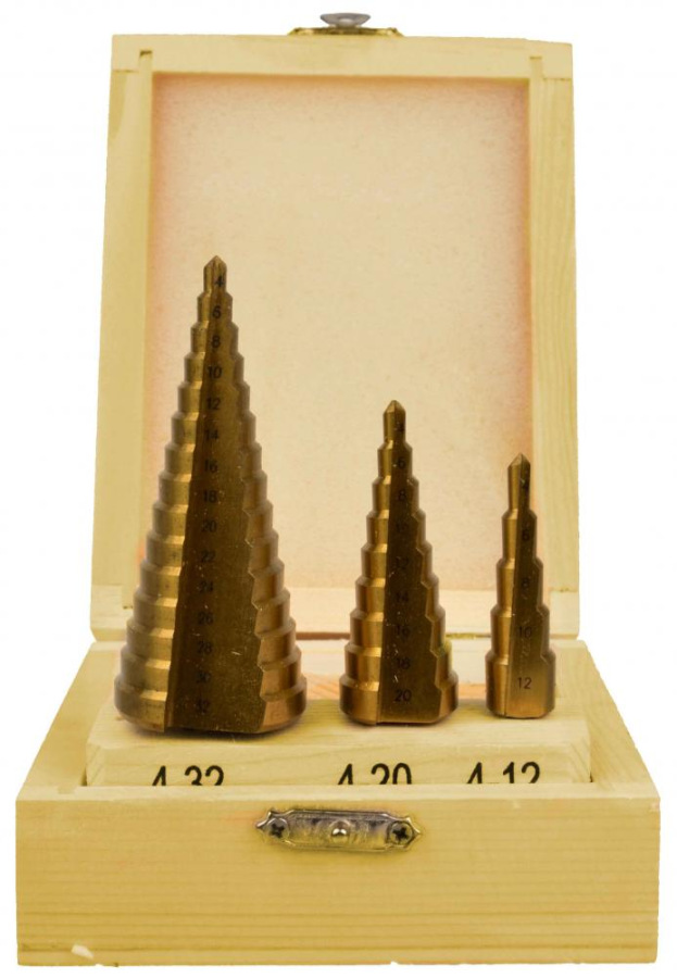 Sada stupňovitých vrtákov vyrobených z titánovej ocele HSS. Táto súprava umožňuje vŕtať dokonale okrúhle otvory do ocele, mosadze, medi, hliníka, dreva a plastu.