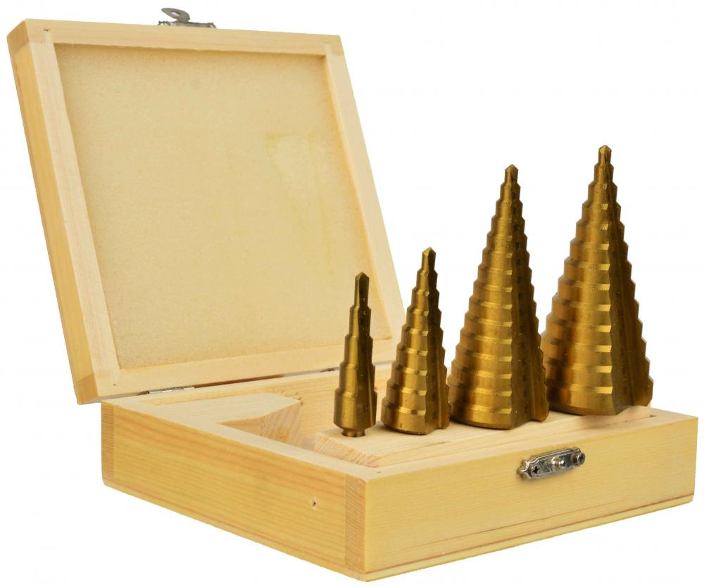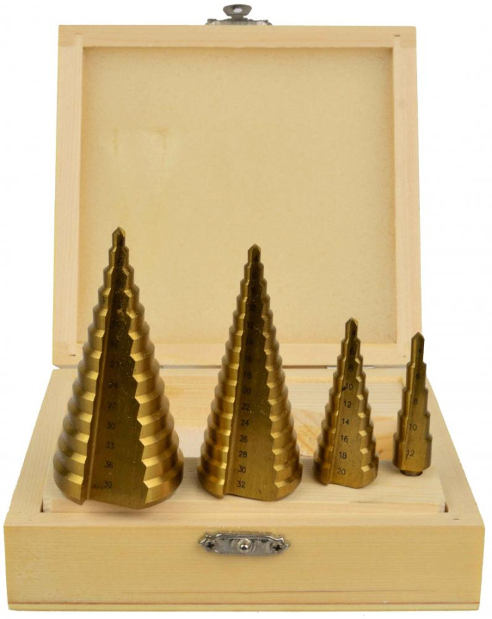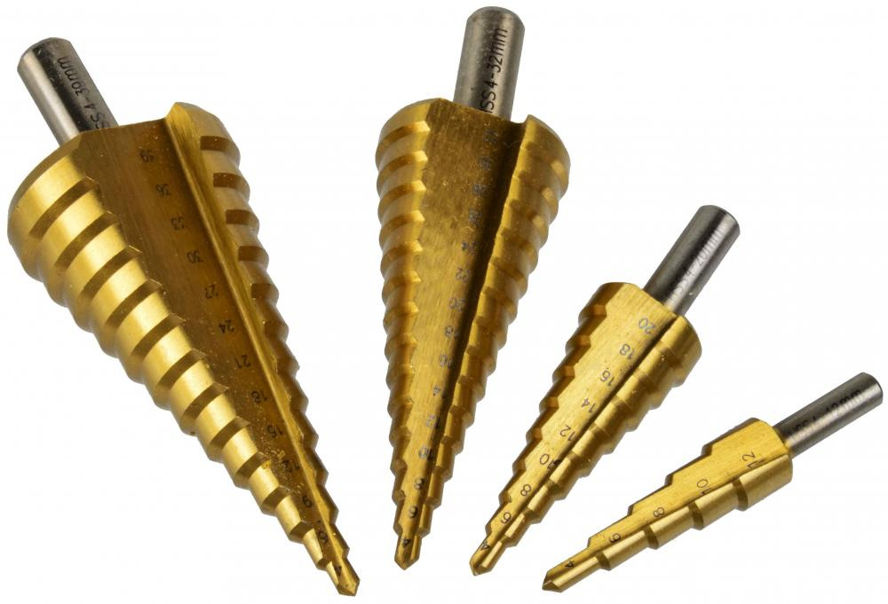 Sada stupňovitých vrtákov vyrobených z titánovej ocele HSS. Táto súprava umožňuje vŕtať dokonale okrúhle otvory do ocele, mosadze, medi, hliníka, dreva a plastu.