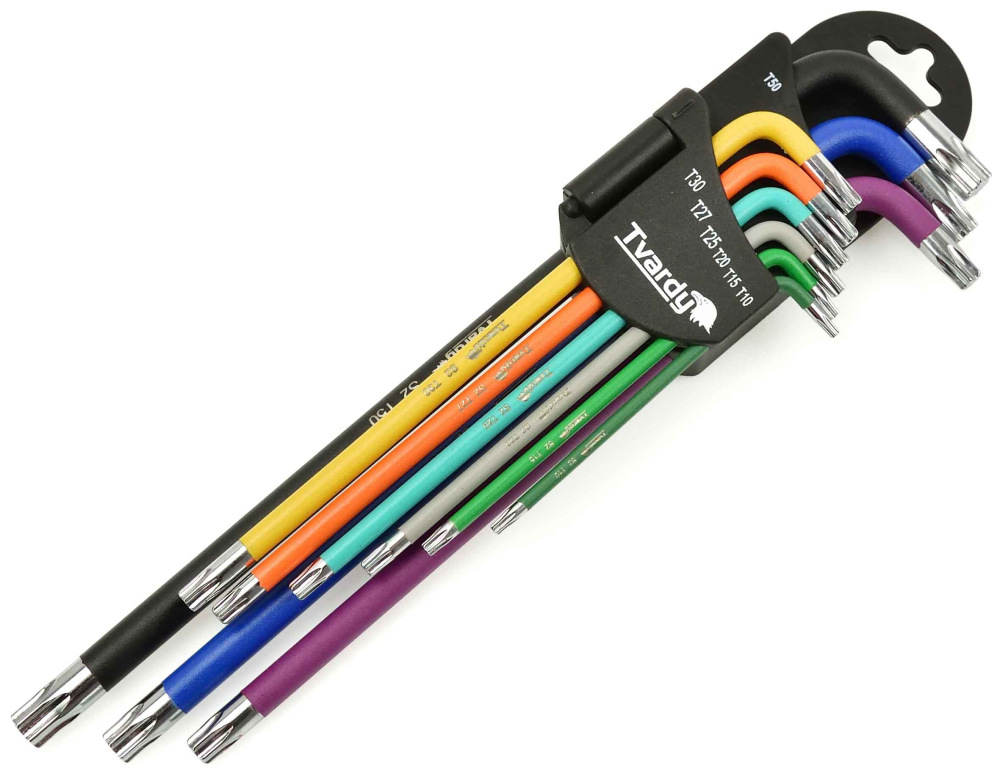 Sada dlhých torx kľúčov 9 kusov. Vyrobené z vysoko kvalitnej ocele S2, ktorá je oveľa odolnejšia ako bežne používaná nástrojová oceľ CrV . Dĺžka kľúča umožňuje prácu na ťažko dostupných miestach. Rôzne farby kľúčov uľahčujú výber správnej veľkosti kľúča.