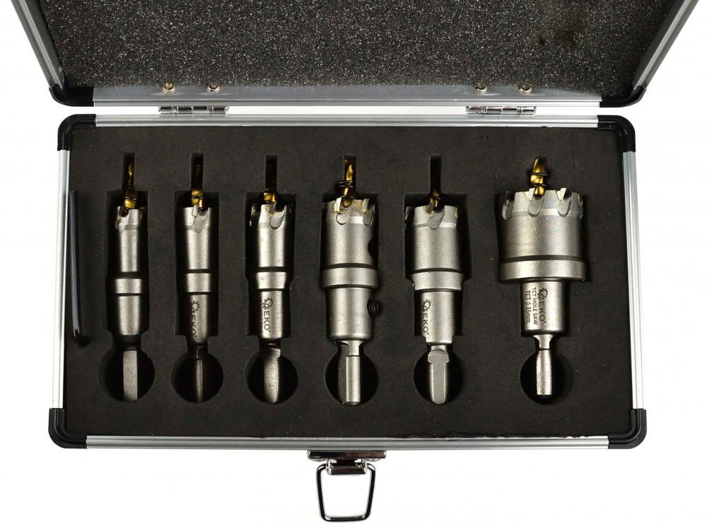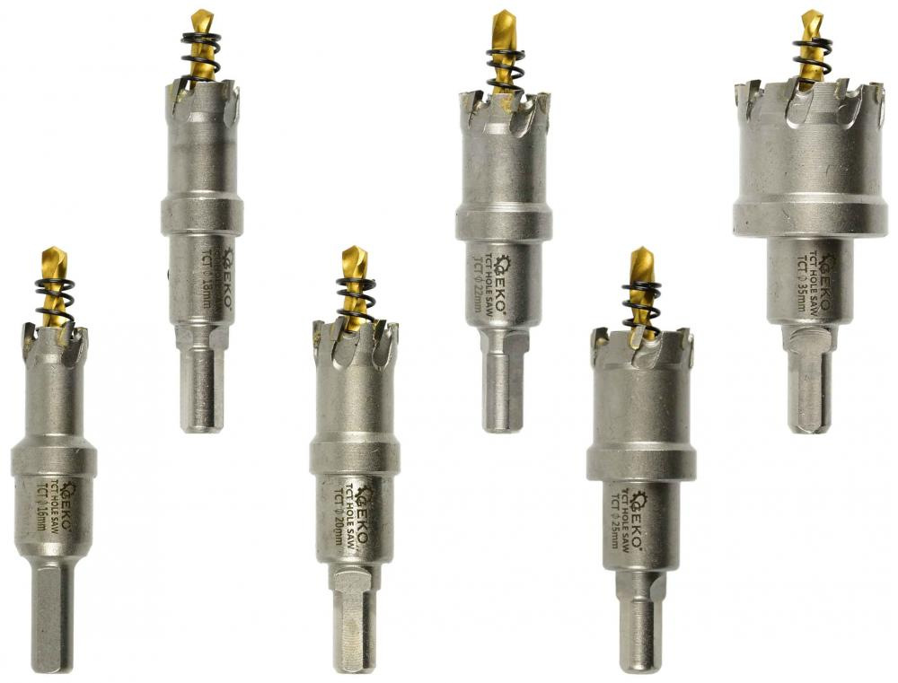Sada 6 TCT dierových píl na kov vo veľkostiach 16-35 mm. Čepele sú vyrobené zo spekaných karbidov, ktoré sa vyznačujú oveľa väčšou tvrdosťou a odolnosťou voči vysokým teplotám v porovnaní s rýchloreznou oceľou HSS. Určené na vytváranie otvorov s väčším priemerom do ocele, liatiny, neželezných kovov, dreva, plastov atď. Na zvýšenie presnosti rezu bol použitý vodiaci vrták HSS. Na predĺženie životnosti dierových píl sa odporúča použitie chladiaceho maziva.