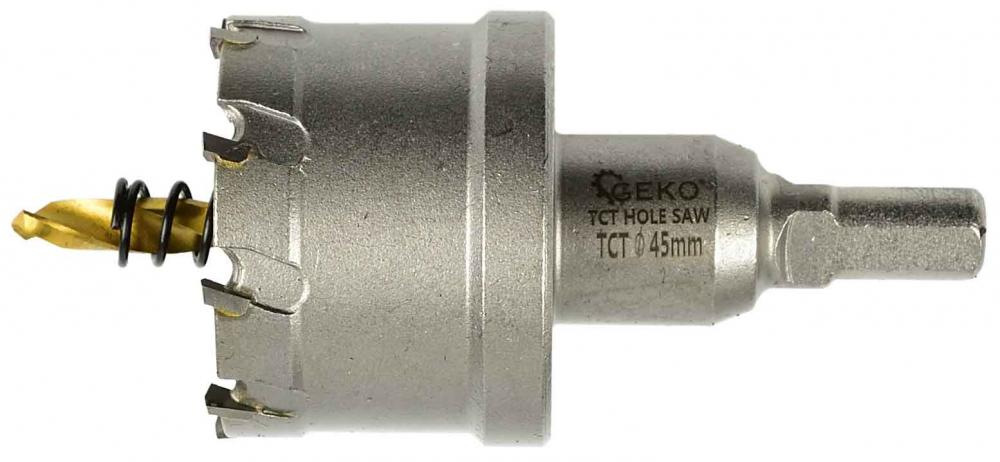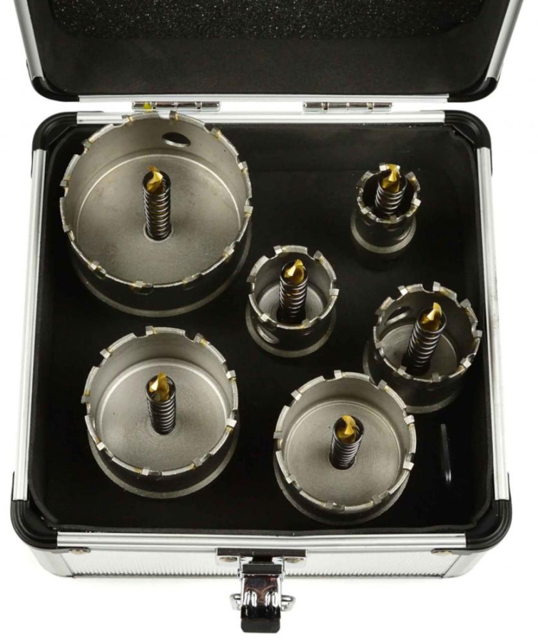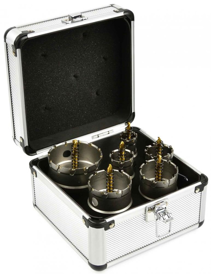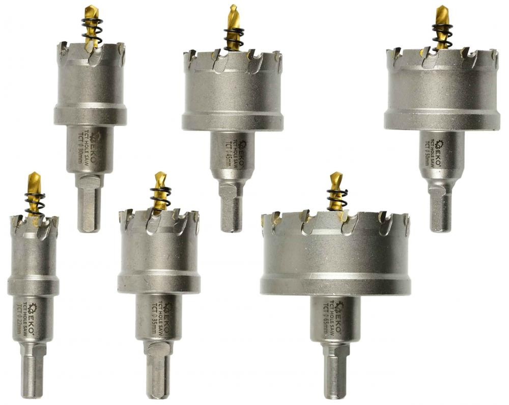 Sada 6 TCT dierových píl na kov vo veľkostiach 22-65 mm. Čepele sú vyrobené zo spekaných karbidov, ktoré sa vyznačujú oveľa väčšou tvrdosťou a odolnosťou voči vysokým teplotám v porovnaní s rýchloreznou oceľou HSS. Určené na vytváranie otvorov s väčším priemerom do ocele, liatiny, neželezných kovov, dreva, plastov atď. Na zvýšenie presnosti rezu bol použitý vodiaci vrták HSS. Na predĺženie životnosti dierových píl sa odporúča použitie chladiaceho maziva.