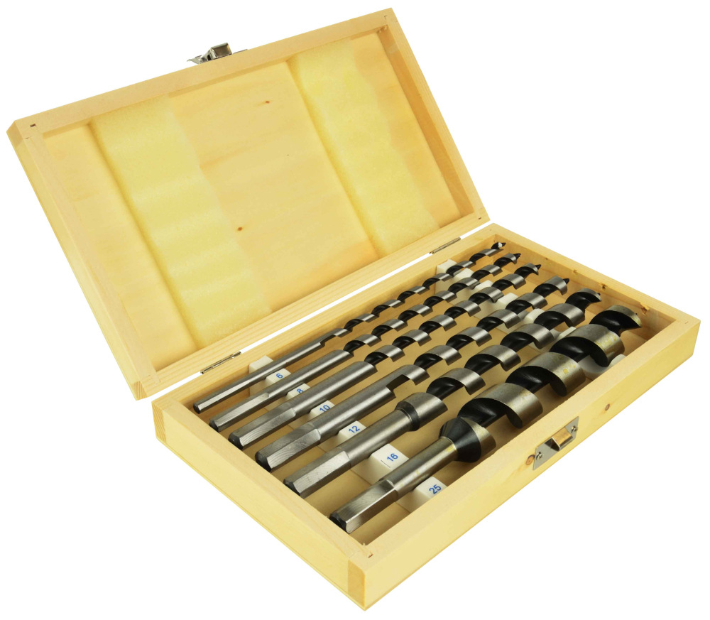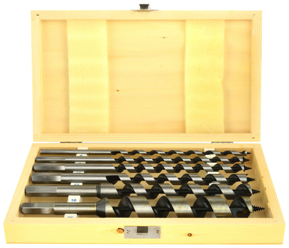 Sada 6 kusov hadovitých vrtákov do dreva v drevenej krabičke.