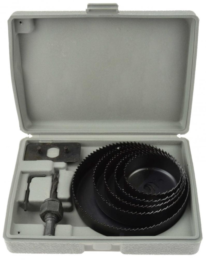 Sada 64-127 mm vykružovacích píl na drevo, sadrokartónové dosky, drevotrieskové dosky a plasty. Sada pozostáva z 8 prvkov.