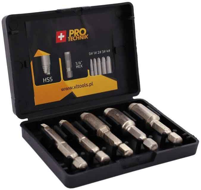 Profesionálna 5-dielna sada vyťahovačov na povoľovanie zlomených skrutiek. Sú vyrobené z rýchloreznej ocele HSS , ktorý zaisťuje odolnosť a odolnosť náradia Sada obsahuje 5 vyťahovačov s rôznymi priemermi a šesťhrannou stopkou 1/4" (6,35 mm), vďaka čomu je nenahraditeľným nástrojom v dielni alebo autoservise.