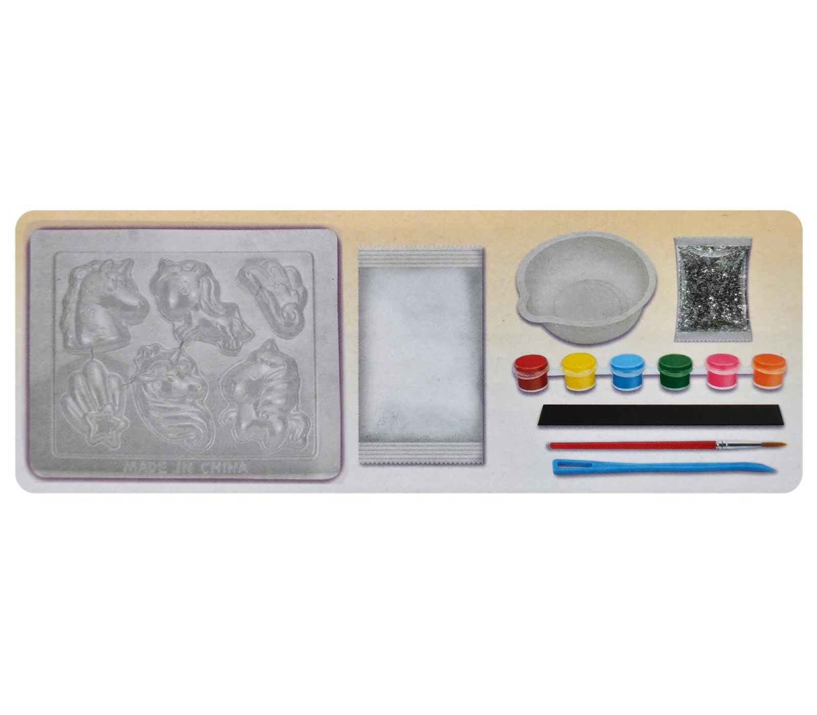 Sádrové odliatky s magnetom Jednorožec, obdaruj kamarátku, mamičku alebo babičku vlastnoručne vyrobenou magnetkou. Balenie obsahuje sadru, mištičku na miešanie sadry, miešaciu tyčinku, formu na šesť odliatkov, štetec, šesť farieb, trblietky a magnetku. Cena je za kus. Vhodné pre deti vo veku 3+ rokov.