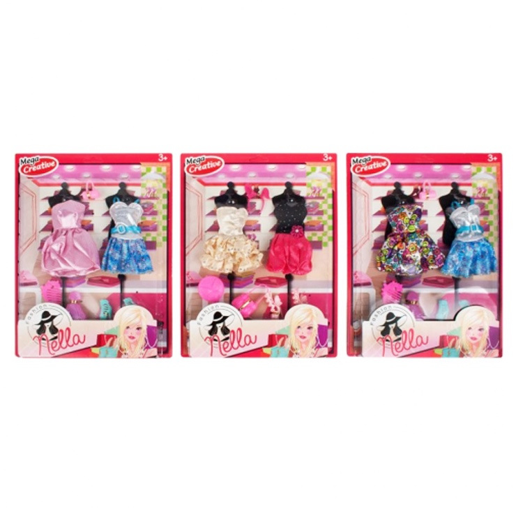 Každá sada obsahuje dvoje šaty a 5 ďalších doplnkov, ktoré doplnia šatník, ako sú topánky, kabelka, kefa / hrebeň na bábiku a gumička do vlasov pre bábiky. Sady pozostávajú zo 6 prvkov. Výrobok je vyrobený z plastu a materiálu. Určené pre deti od 3+ rokov. Nevyžaduje napájanie z batérie. Rozmery balenia [cm]: 25x33x3.