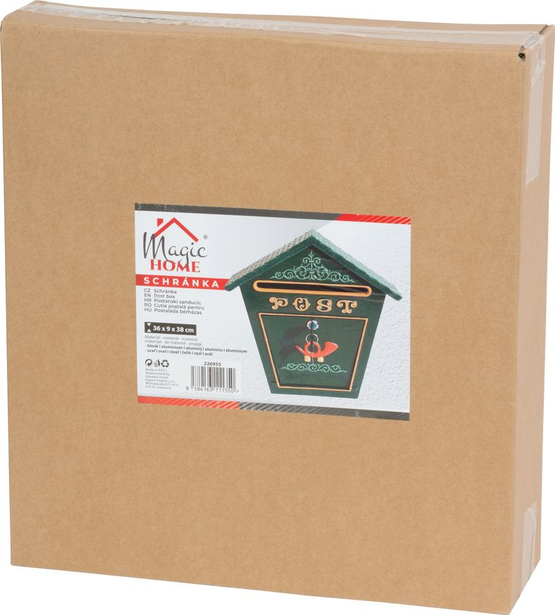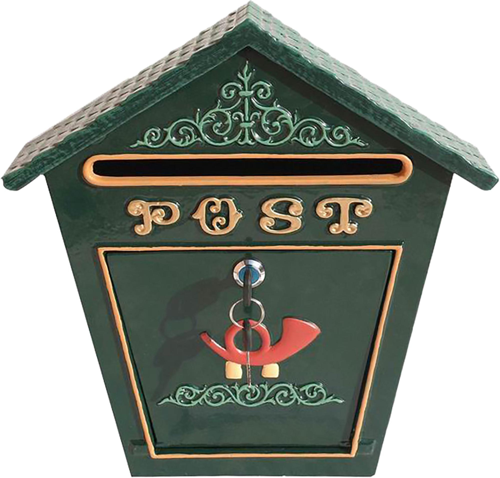 Poštová schránka Albert v elegantnej zelenej farbe je navrhnutá v tradičnom štýle s ozdobným reliéfom a výrazným nápisom POST. Vďaka svojmu tvaru so strieškou pôsobí dekoratívne a zároveň chráni poštu pred nepriaznivým počasím.