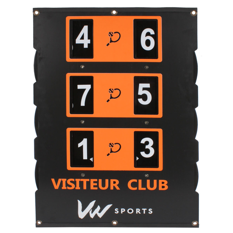 Vďaka obojstrannému ukazovateľovi skóre Merco Scoreboard FR budete spoľahlivo zaznamenávať priebeh každého tenisového duelu. Trojsetový ukazovateľ skóre s rozpätím bodov 0 – 7 má 9 cm veľké biele číslice na kontrastnom čiernom podklade a neónovo zelenom pozadí, aby bolo skóre dobre viditeľné pre hráčov aj pre divákov. Pohyb číslic zaisťujú manuálne posuvné kolesá po stranách ukazovateľa. Celkové rozmery ukazovateľa vyrobeného z odolného ABS plastu sú 83 x 58 cm a na svojom hornom i dolnom pogumovanom okraji je doplnený otvormi na zavesenie. Vzhľadom k použitému materiálu má Scoreboard nízku hmotnosť 3,4 kg. Tento model je vyrobený s francúzskymi nápismi. - materiál: ABS plast, guma