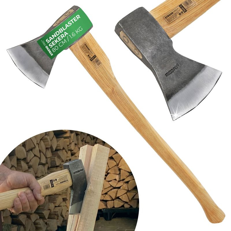 Sekera na rúbanie dreva, s drevenou lakovanou rukoväťou. Hlava sekery je pieskovaná a lakovaná.