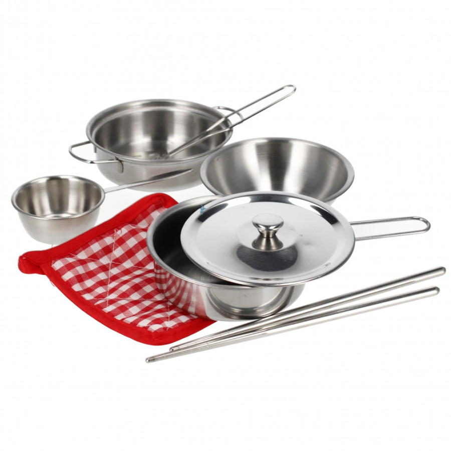 Set do kuchyne, obsah súpravy je 1x hrniec s rukoväťou, 1x utierka, 2x hrniec, 1x pokrievka, 1x misa, 1x naberačka, 1x sada. paličky. Rozmery balenia sú 21x34x5cm. hmotnosť produktu bez obalu [kg]: Výrobok je určený pre deti vo veku: 3+.