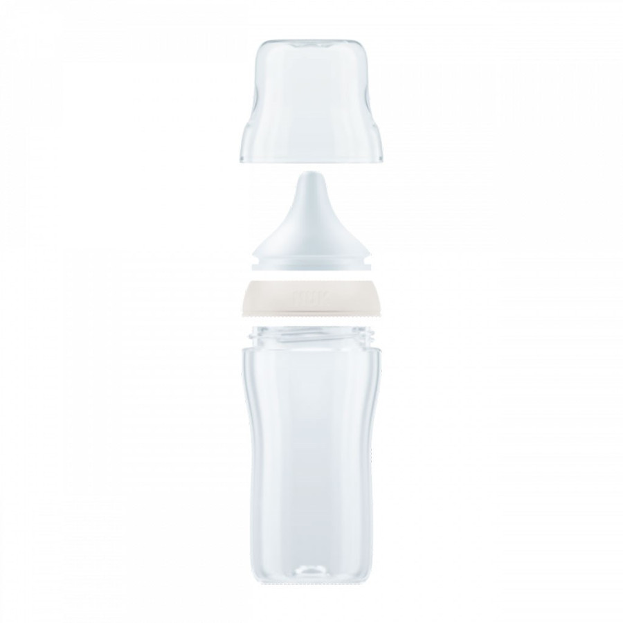 Sklenená dojčenská fľaša NUK Perfect Match s kontrolou teploty a mäkkým silikónovým cumlíkom. Špeciálny tvar typický pre cumlíky NUK s ortodontickým antikolikovým cumlíkom je modelovaný podľa materskej bradavky pri dojčení. Ponecháva dostatok priestoru pre prirodzené sacie pohyby jazyka aj čeľuste. Veľká, široká opora pier pri pití pripomína matkinu pokožku. Fľaša je navrhnutá tak, aby bábätko neprišlo do kontaktu s pevnými plastovými časťami. Vylepšený systém proti prehĺtaniu vzduchu pri pití Anti Colic Air System zabezpečuje prirodzený tok mlieka, aby dieťa pilo uvoľnene bez prehĺtania vzduchu. Hladko sa zužujúci tvar s antikolikovou funkciou pre plynulý a nerušený prietok pitia, veľkosť M (od 3 m, pre materské mlieko). Dojčenské fľaše sú teraz vybavené novým NUK kontrolným ukazovateľom teploty, ktorý pomáha zabrániť tomu, aby vaše dieťa pilo príliš horúci príkrm. Ukazovateľ vyzerá ako teplomer, je umiestnený medzi ryskami a teplota obsahu fľaše zmení jeho farbu. Ak je príkrm príliš horúci, modrý ukazovateľ sa zmení na biely. V ideálnom prípade by mal príkrm mať telesnú teplotu (37 °C), čo zodpovedá modrému zafarbeniu displeja. Vyrobená z vysoko kvalitného skla a neobsahuje BPA (Bisfenol A). Obsah fľaše 230 ml. Vhodná pre deti od 3 m, veľkosť M (od 3 m = pre materské mlieko). Klinicky testované.