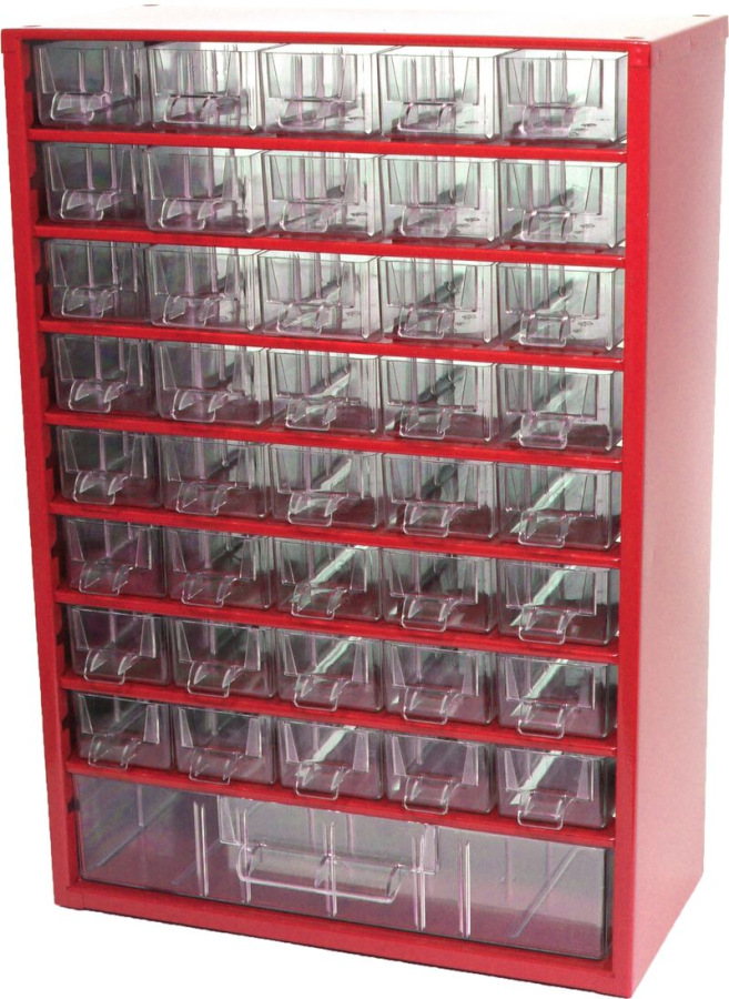 Kvalitné a odolné skrinky, ktoré nesmú chýbať ani vo Vašej dielni, sú vyrobené z oceľového plechu a opatrené odolným práškovým lakom. Číre zásuvky a prepážky sú vyrobené z trvanlivého materiálu PS (polystyrol). Závesné skrinky - tradičný a praktický pomocník na prehľadné skladovanie drobných predmetov, súčiastok a ručného náradia. Skrinky sú vhodné na vybavenie dielní, garáží, výrobných prevádzok a všade tam kde je potrebné mať drobné predmety prehľadne uložené. Závesné skrinky je možné voľne postaviť, stohovať jednu na druhú (podstava je opatrená plastovými nožičkami), alebo zavesiť na stenu. Skrinky sú vyrábané v rôznych veľkostiach a variantoch veľkosti a usporiadania zásuviek. Skrinky je možné kombinovať a tvoriť z nich kompaktné celky. Vnútorné priestory zásuviek je možné jednoducho rozdeliť pomocou plastových prepážok, ktoré nie sú súčasťou skrinky a musia sa samostatne dokúpiť. Na maximalizáciu úložného priestoru na minimálnej ploche odporúčame použitie otočného stojana. Obsahuje 40xA a 1xC prepážiek.