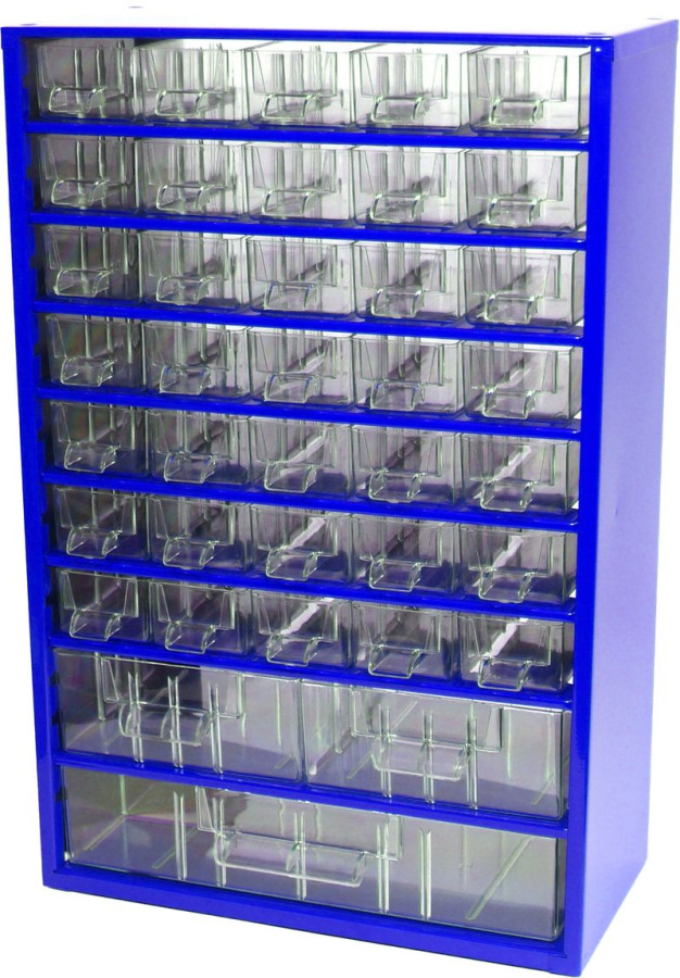 Kvalitné a odolné skrinky, ktoré nesmú chýbať ani vo Vašej dielni, sú vyrobené z oceľového plechu a opatrené odolným práškovým lakom. Číre zásuvky a prepážky sú vyrobené z trvanlivého materiálu PS (polystyrol). Závesné skrinky - tradičný a praktický pomocník na prehľadné skladovanie drobných predmetov, súčiastok a ručného náradia. Skrinky sú vhodné na vybavenie dielní, garáží, výrobných prevádzok a všade tam kde je potrebné mať drobné predmety prehľadne uložené. Závesné skrinky je možné voľne postaviť, stohovať jednu na druhú (podstava je opatrená plastovými nožičkami), alebo zavesiť na stenu. Skrinky sú vyrábané v rôznych veľkostiach a variantoch veľkosti a usporiadania zásuviek. Skrinky je možné kombinovať a tvoriť z nich kompaktné celky. Vnútorné priestory zásuviek je možné jednoducho rozdeliť pomocou plastových prepážok, ktoré nie sú súčasťou skrinky a musia sa samostatne dokúpiť. Na maximalizáciu úložného priestoru na minimálnej ploche odporúčame použitie otočného stojana. Obsahuje 35xA, 4xB prepážiek.
