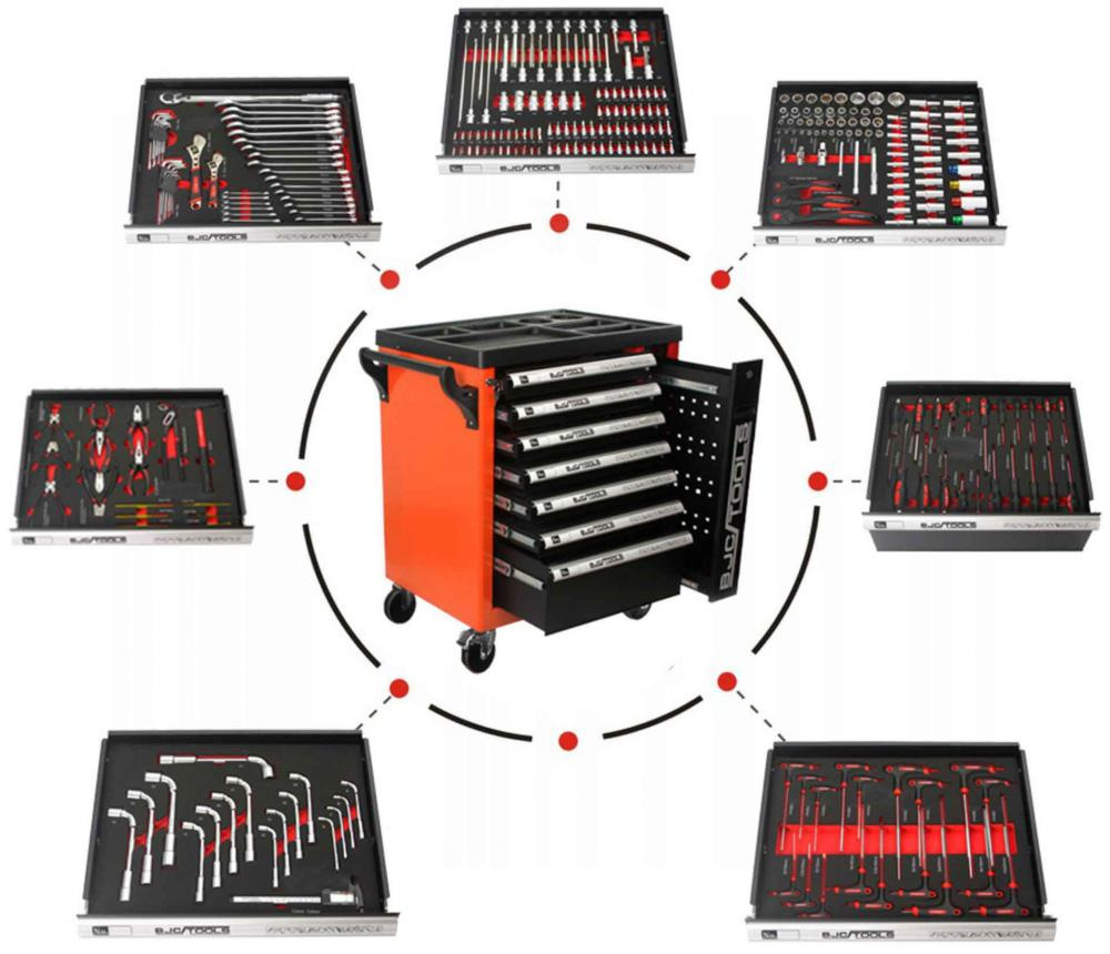Skrinka na náradie so 7 zásuvkami, vybavená náradím, 298-dielna, BJC