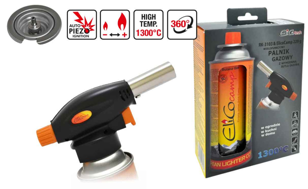 Spájkovacia lampa s piezo zapaľovačom a kartušou 220g, otočný uzáver, ELICO
