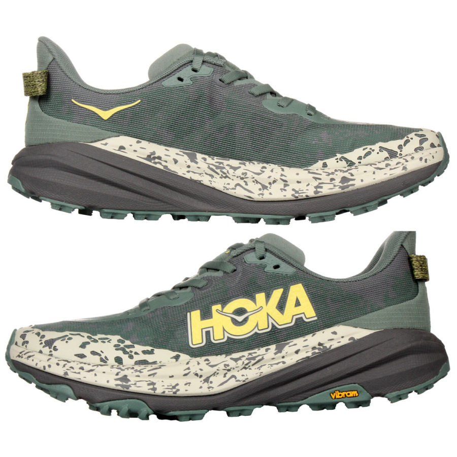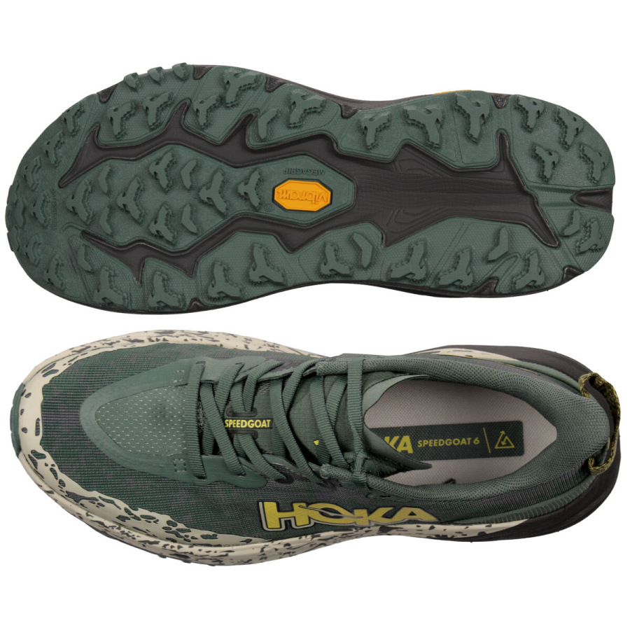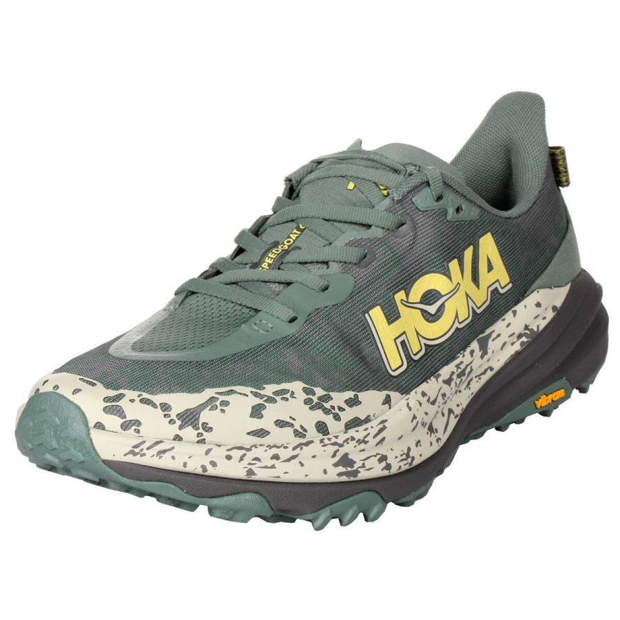 Hoka One One Speedgoat je jeden z najpopulárnejších modelov, ktorý je navrhnutý do technicky náročnejšieho terénu. Už šiesty rad ponúka pohodlie vďaka osvedčenému tlmeniu a skvelú trakciu aj na drsnejšom povrchu vďaka technológii Vibram® Megagrip s konštrukciou Traction Lug. Model Speedgoat 6 si zachováva rovnakú výšku podrážky a tvar kolísky ako predchádzajúci model, využíva ľahšiu zmes materiálu v medzipodrážke a priedušný zvršok z tkanej textílie pre ľahký a zároveň komfortný beh. - ľahký tkaný zvršok
