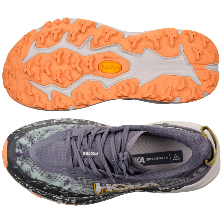 Hoka One One Speedgoat je jeden z najpopulárnejších modelov, ktorý je navrhnutý do technicky náročnejšieho terénu. Už šiesty rad ponúka pohodlie vďaka osvedčenému tlmeniu a skvelú trakciu aj na drsnejšom povrchu vďaka technológii Vibram® Megagrip s konštrukciou Traction Lug. Model Speedgoat 6 si zachováva rovnakú výšku podrážky a tvar kolísky ako predchádzajúci model, využíva ľahšiu zmes materiálu v medzipodrážke a priedušný zvršok z tkanej textílie pre ľahký a zároveň komfortný beh. - ľahký tkaný zvršok