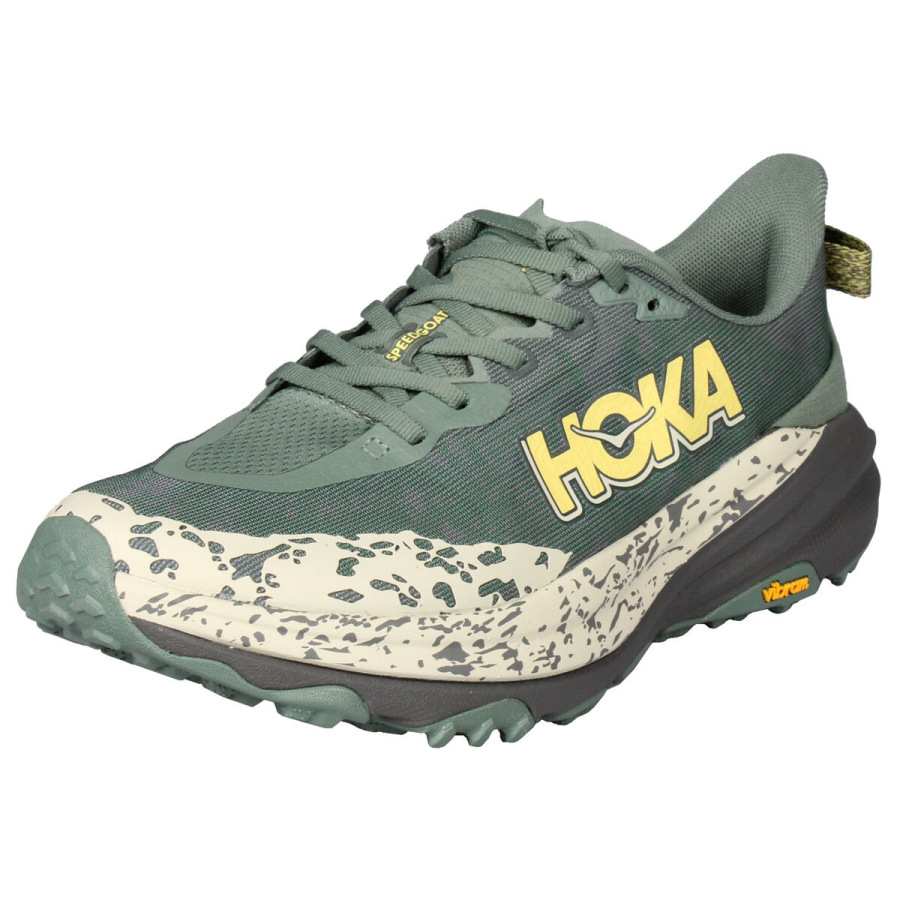 Hoka One One Speedgoat je jeden z najpopulárnejších modelov, ktorý je navrhnutý do technicky náročnejšieho terénu. Už šiesty rad ponúka pohodlie vďaka osvedčenému tlmeniu a skvelú trakciu aj na drsnejšom povrchu vďaka technológii Vibram® Megagrip s konštrukciou Traction Lug. Model Speedgoat 6 si zachováva rovnakú výšku podrážky a tvar kolísky ako predchádzajúci model, využíva ľahšiu zmes materiálu v medzipodrážke a priedušný zvršok z tkanej textílie pre ľahký a zároveň komfortný beh. - ľahký tkaný zvršok