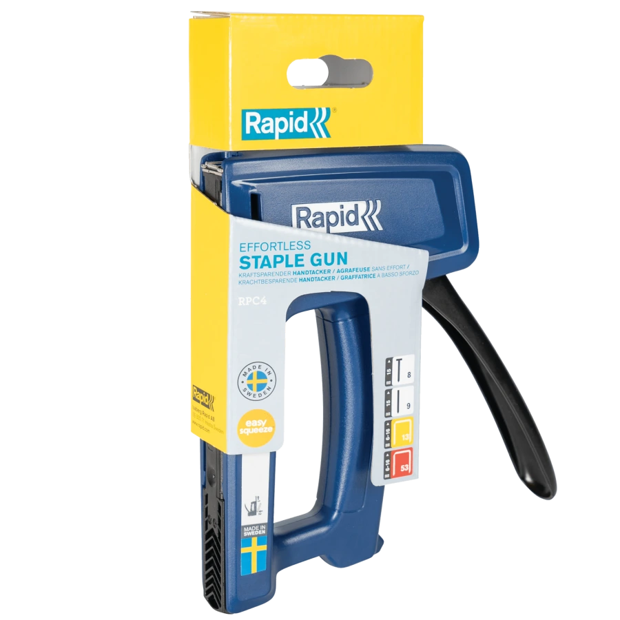 Ručná sponkovačka RAPID RPC4 je všestranný nástroj, ktorý ponúka širokú škálu možností upevňovania. Je kompatibilná so sponami typu 53 a 13 s dĺžkou od 6 do 16 mm, klincami typu 8 (15 mm) a pinmi typu 9 (15 mm). Tento nástroj je ideálny pre rôzne projekty, ako je čalúnenie, upevňovanie fólií, textílií, dreva či dekorácií. Ergonomická rukoväť zaručuje pohodlné a efektívne používanie aj pri dlhších úlohách. Robustná konštrukcia a jednoduché použitie robia z RAPID RPC4 spoľahlivého pomocníka pre domáce aj profesionálne využitie.