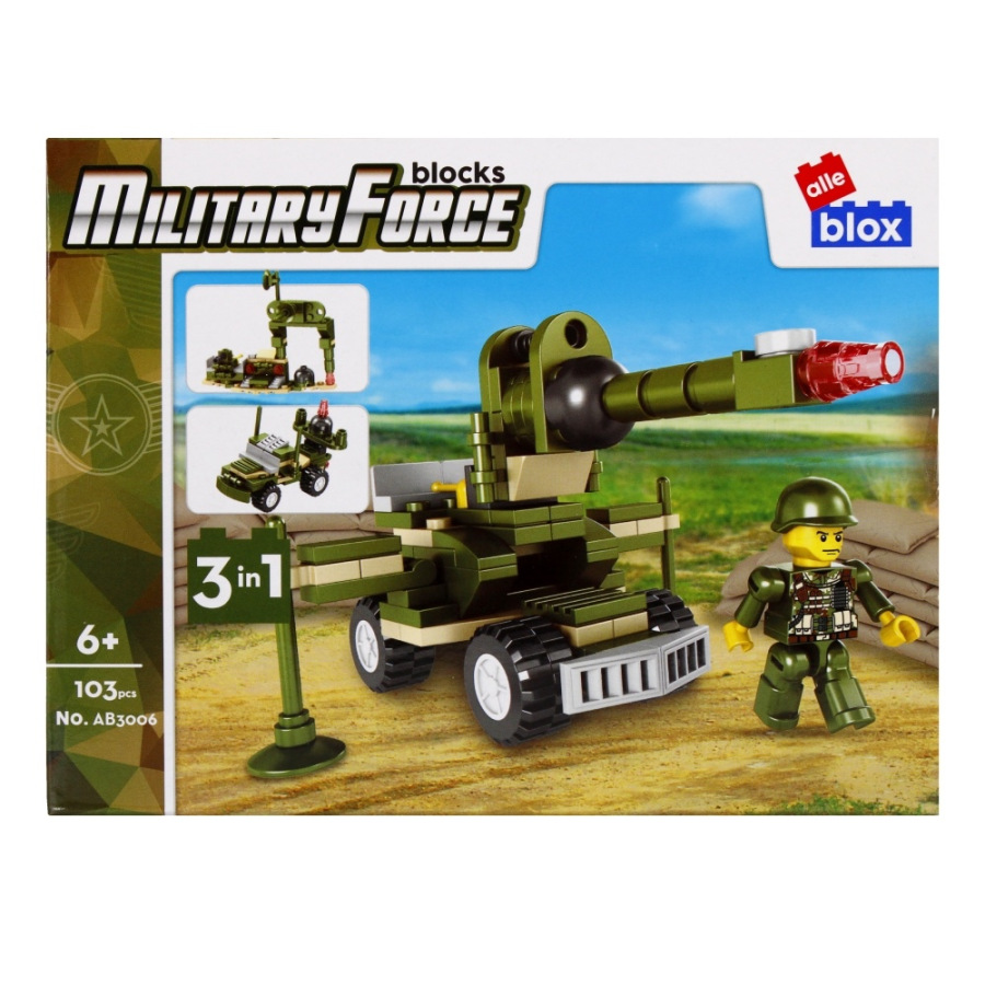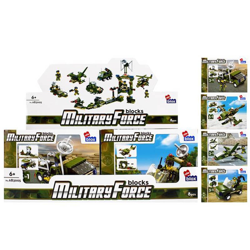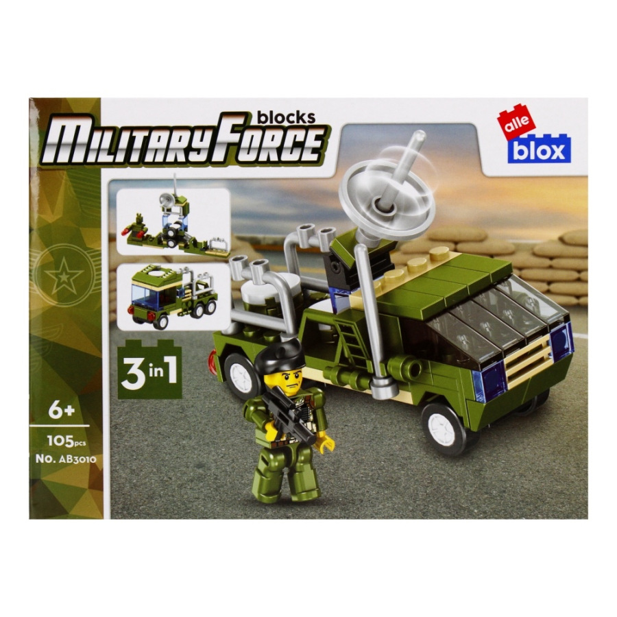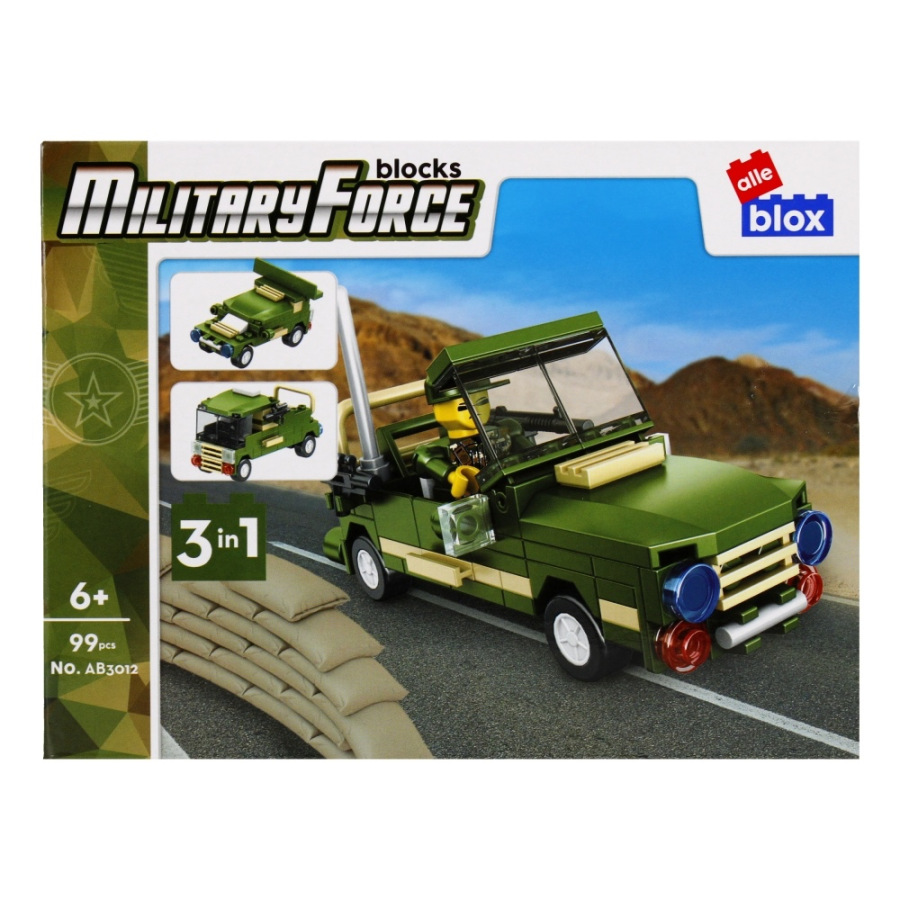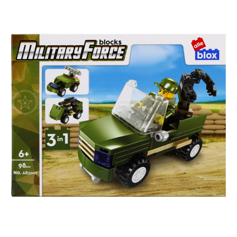 Vojenské vozidlo s postavičkou Stavebnica, má rozmery 15x7x8 cm. Na výber z ôsmich variánt. Balené v boxe po 8 ks. Cena je za kus, ktorý obsahuje od 96 až 104 prvkov a montážny návod. Vhodné pre deti 6+.