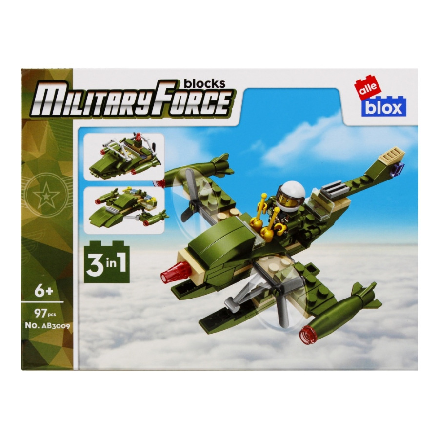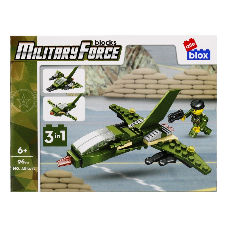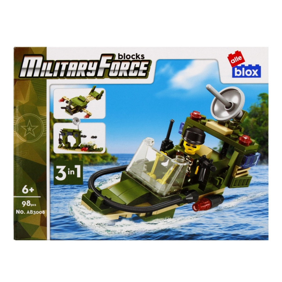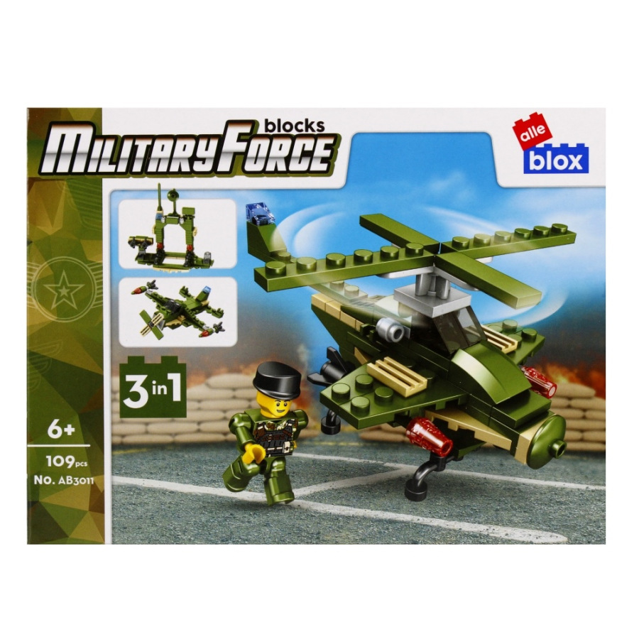 Vojenské vozidlo s postavičkou Stavebnica, má rozmery 15x7x8 cm. Na výber z ôsmich variánt. Balené v boxe po 8 ks. Cena je za kus, ktorý obsahuje od 96 až 104 prvkov a montážny návod. Vhodné pre deti 6+.