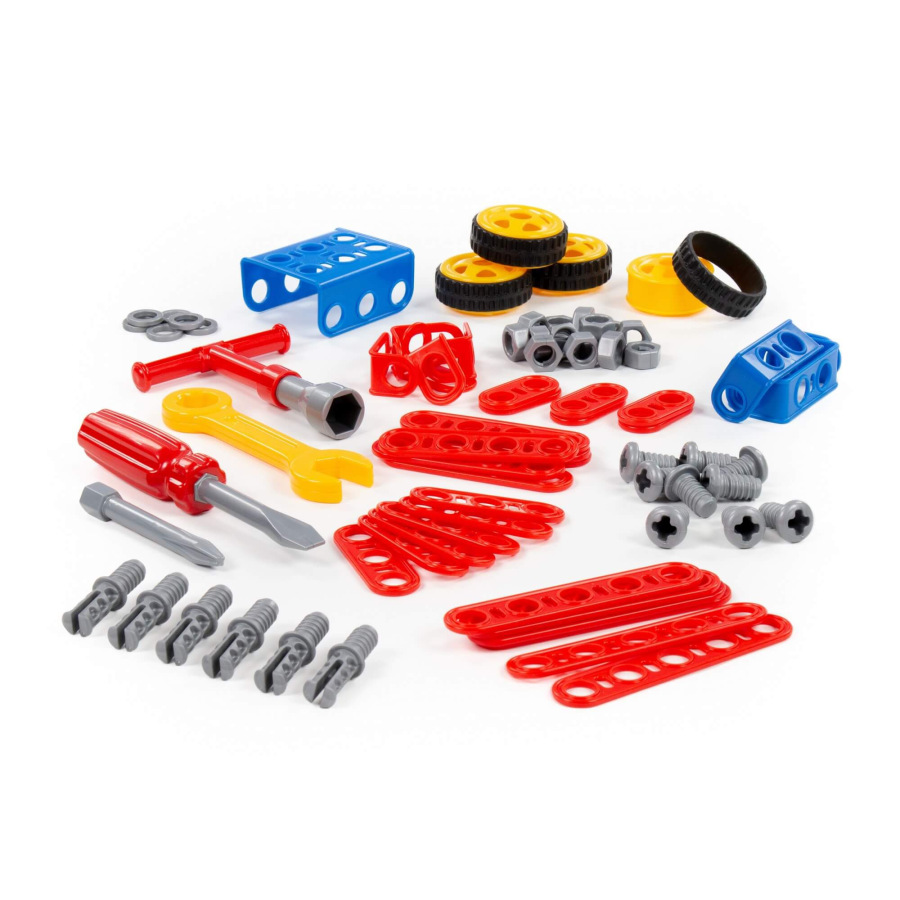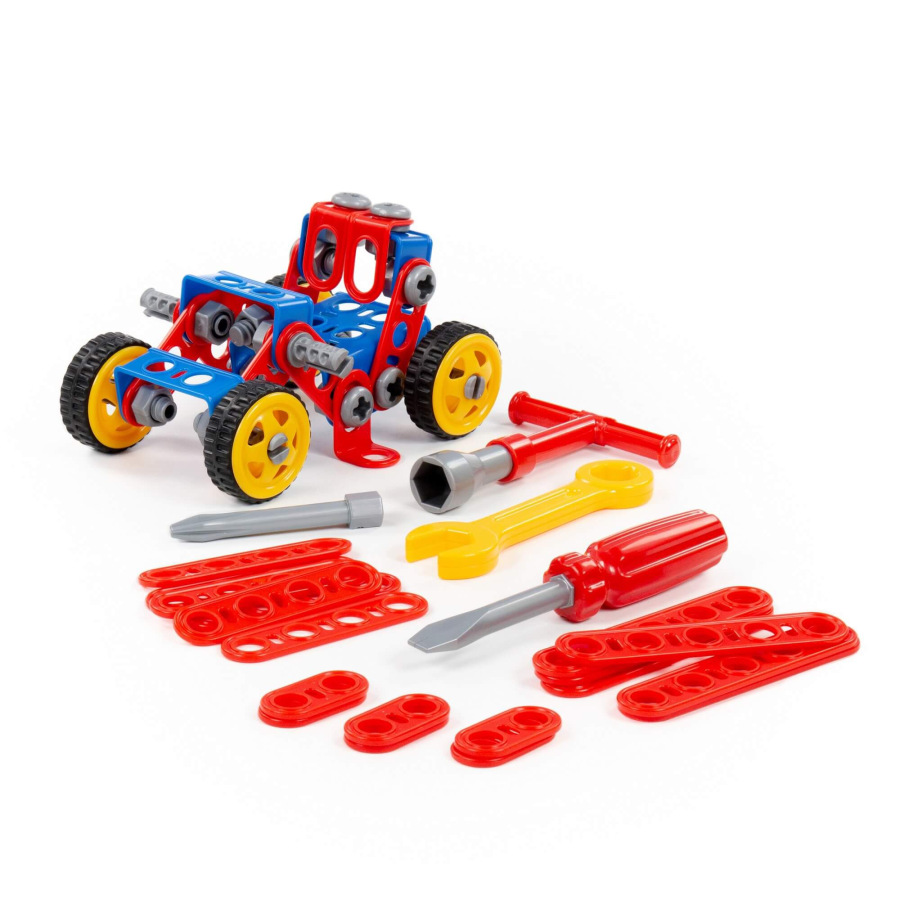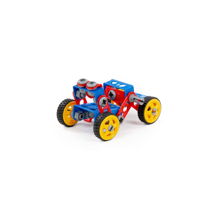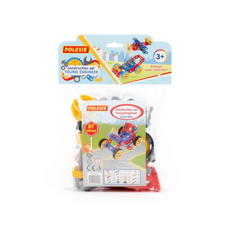 Stavebnica Malý Inžinier 87. V balení je 87 častí na poskladanie štvorkolky, ale aj iného kreatívneho modelu na kolieskach s gumovou pneumatikou s priemerom 5,5 cm. Jednotlivé časti sa spájajú skrutkami a maticami priloženým náradím. Hračka podporuje rozvoj jemnej motoriky, rozvoj základných technických zručností a návykov.