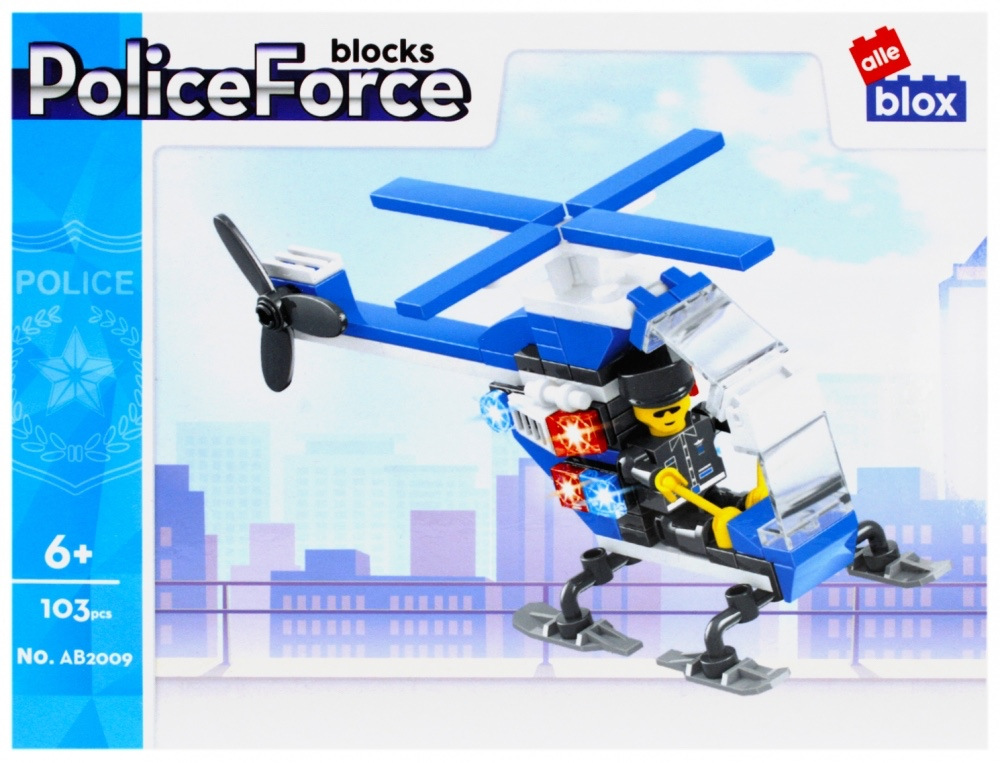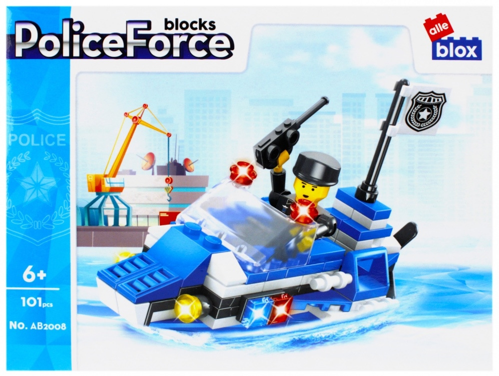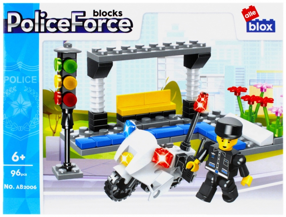 Policajt panáčik s vozidlom Stavebnica, má rozmery 12x8x6 cm. Na výber zo štyroch variánt. Balené v boxe po 12 ks. Cena je za kus, ktorý obsahuje od 96 do 104 prvkov a montážny návod. Vhodné pre deti 6+.
