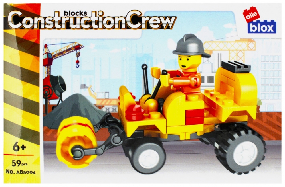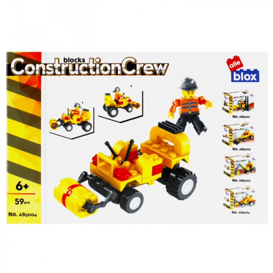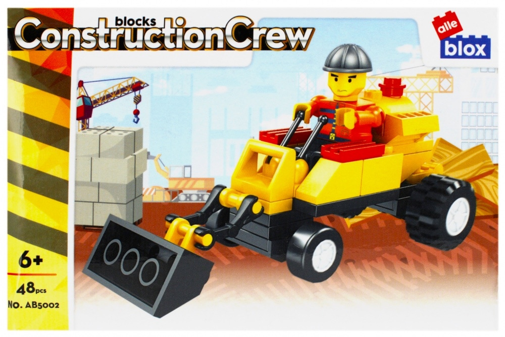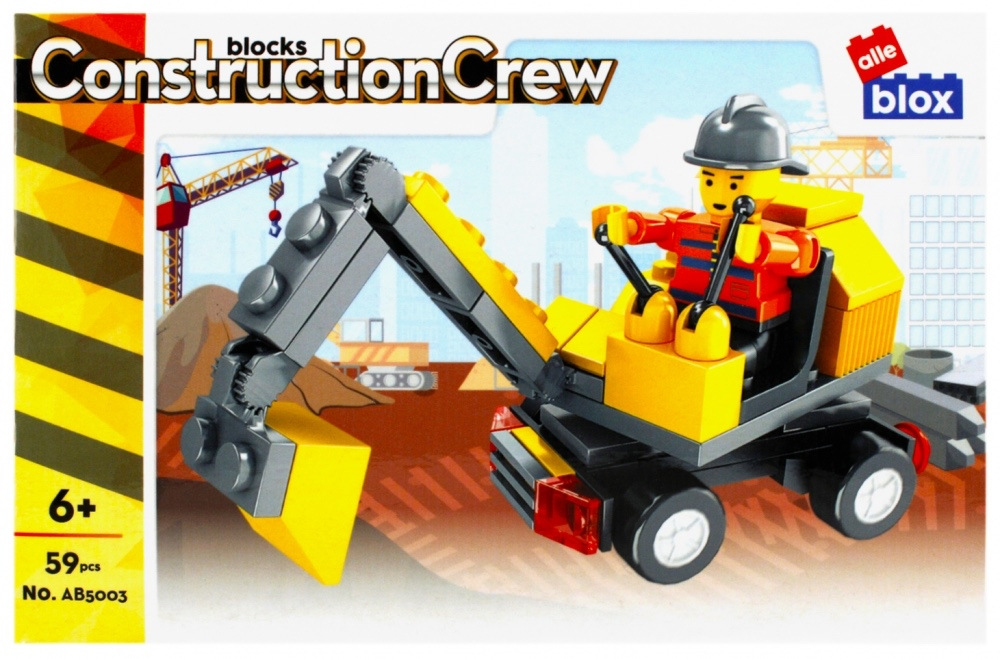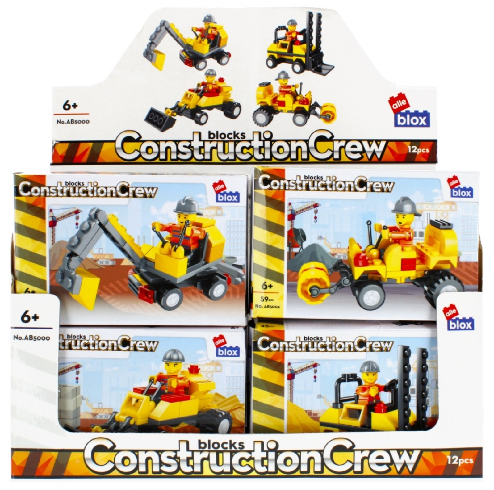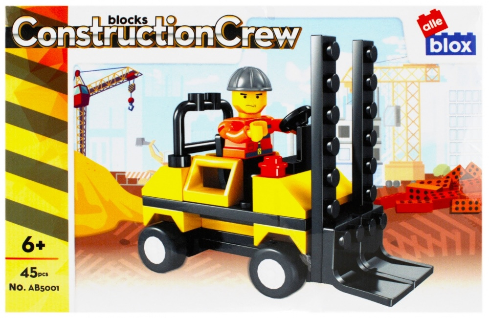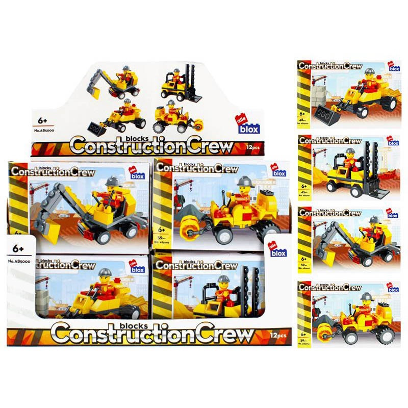 Stavebný stroj s postavičkou Stavebnica, balenie produktu má rozmery 15x10x5 cm. Na výber zo štyroch variánt. Balené v boxe po 12 ks. Cena je za kus, ktorý obsahuje 45 až 59 prvkov a montážny návod. Vhodné pre deti 6+.