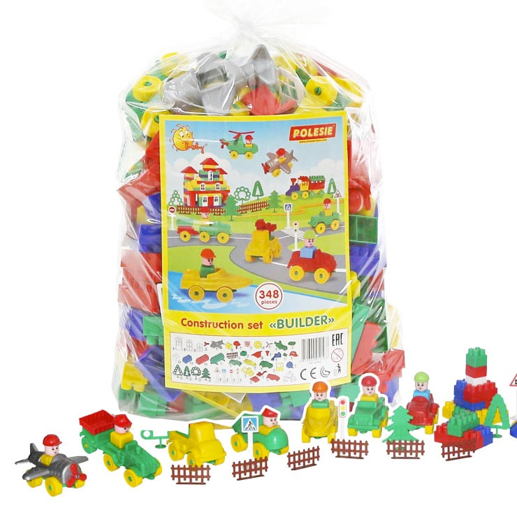 Stavebnica Staviteľ 348. V balení sú plastové stavebné častí, stromčeky, kolieska a pod. spolu 348 dielov.